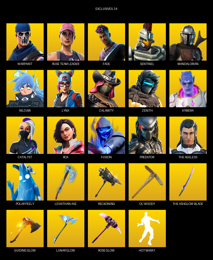 Warpaint, Rose Team Leader, Fade, Sentinel, Mandalorian, Nezumi, Lynx, Calamity, Zenith, Kymera, Catalyst, Rox, Fusion, Predator, The Ageless, Mave, Vega, Dusty, Giddy-up, Polar Peely