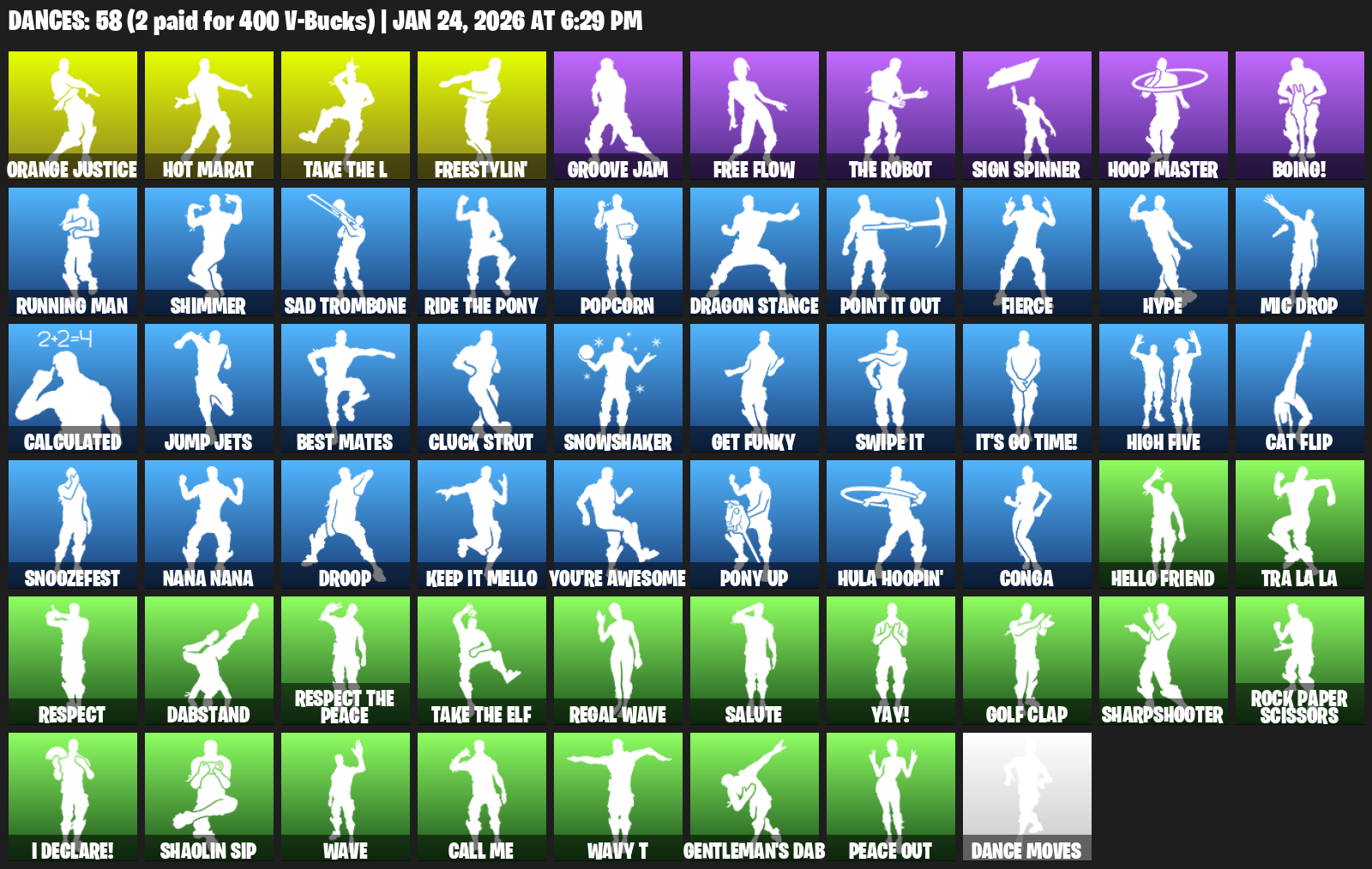 Hot Marat, Orange Justice, Freestylin’, Groove Jam, Free Flow, Sign Spinner, Hoop Master, Boing!, Running Man, Shimmer, Sad Trombone, Popcorn, Dragon Stance, Point It Out, Fierce, Hype, Mic Drop