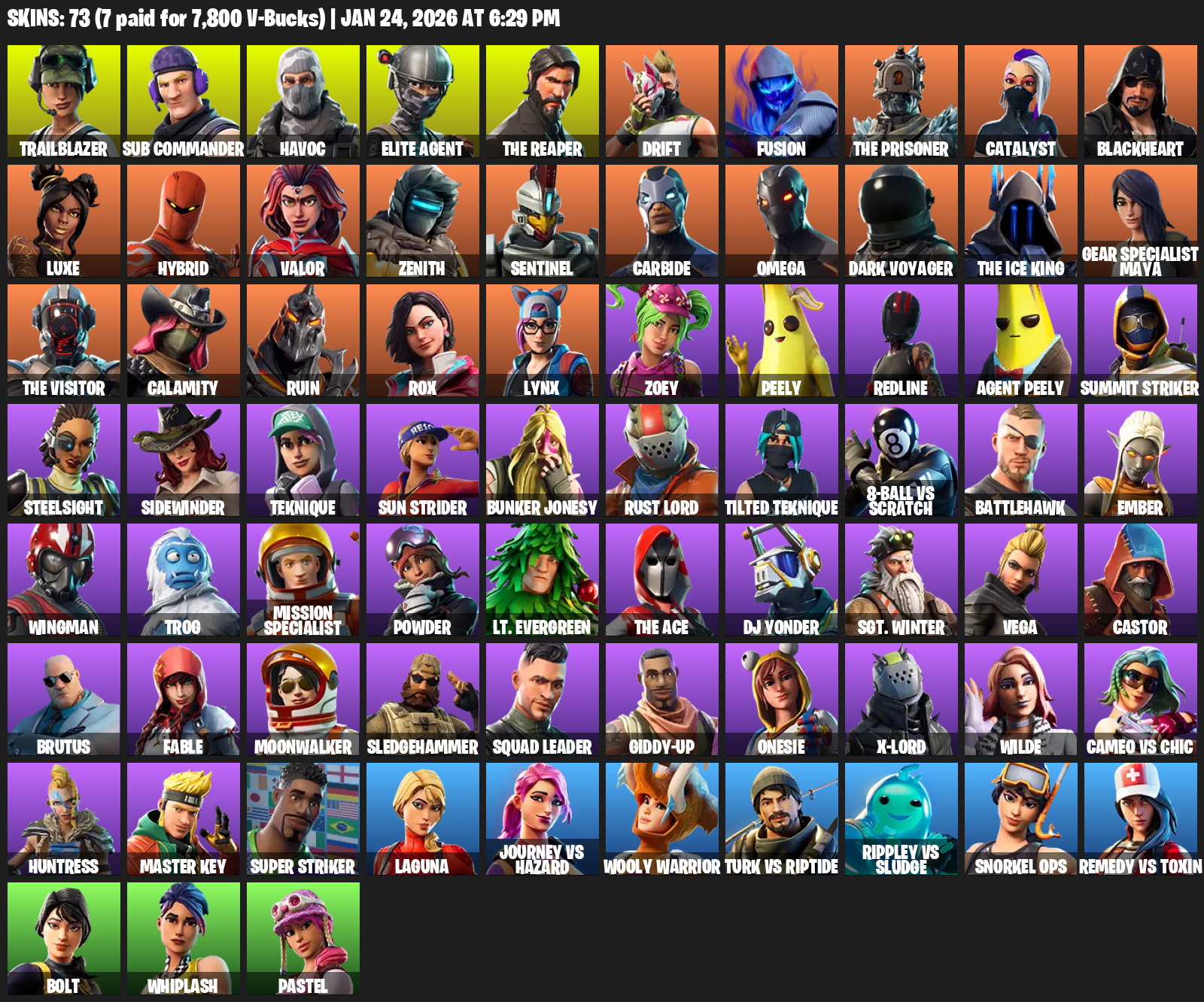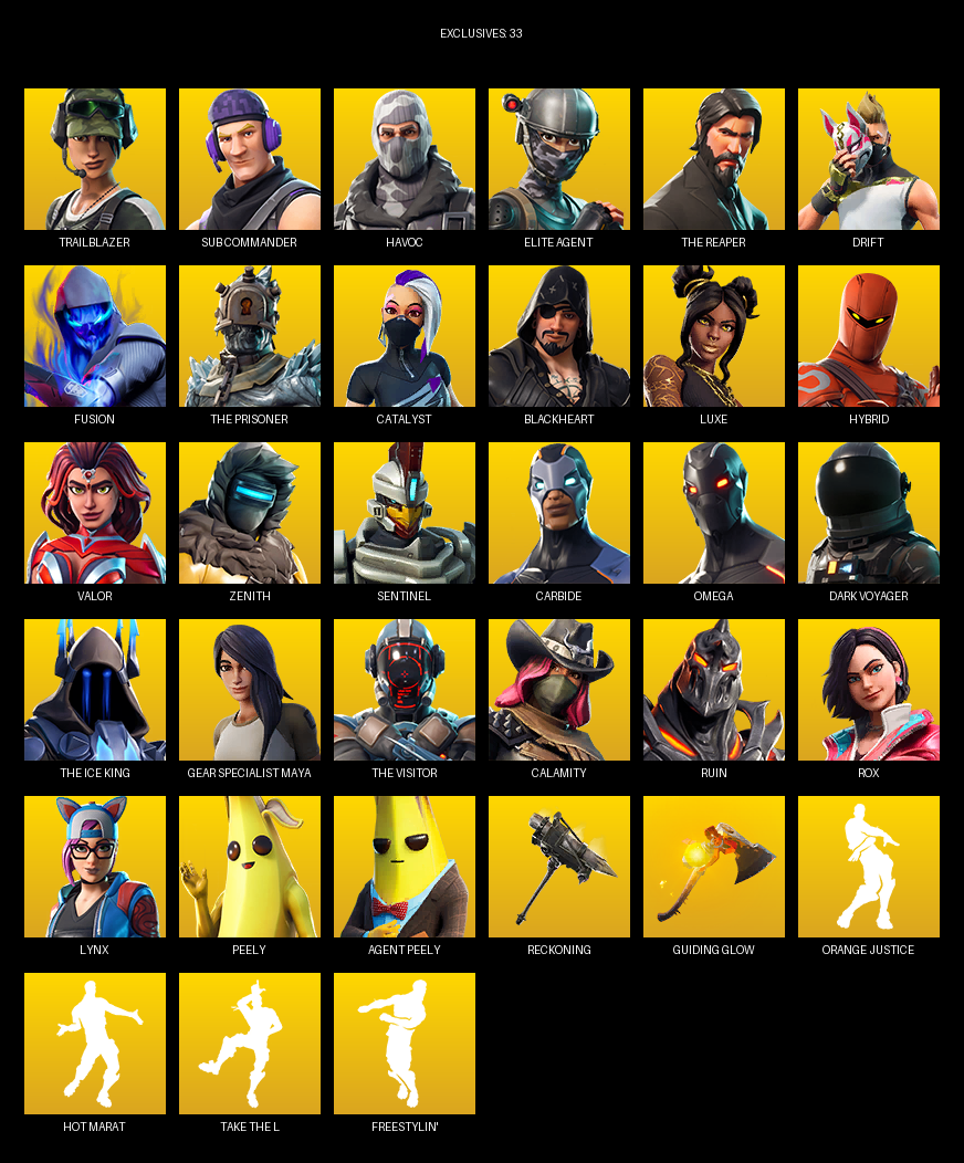 Elite Agent, The Reaper, Omega, Gear Specialist Maya, Trailblazer, Sub Commander, Havoc, Drift, Fusion, Catalyst, Blackheart, Luxe, Hybrid, Valor, Zenith, Sentinel, Carbide, Dark Voyager