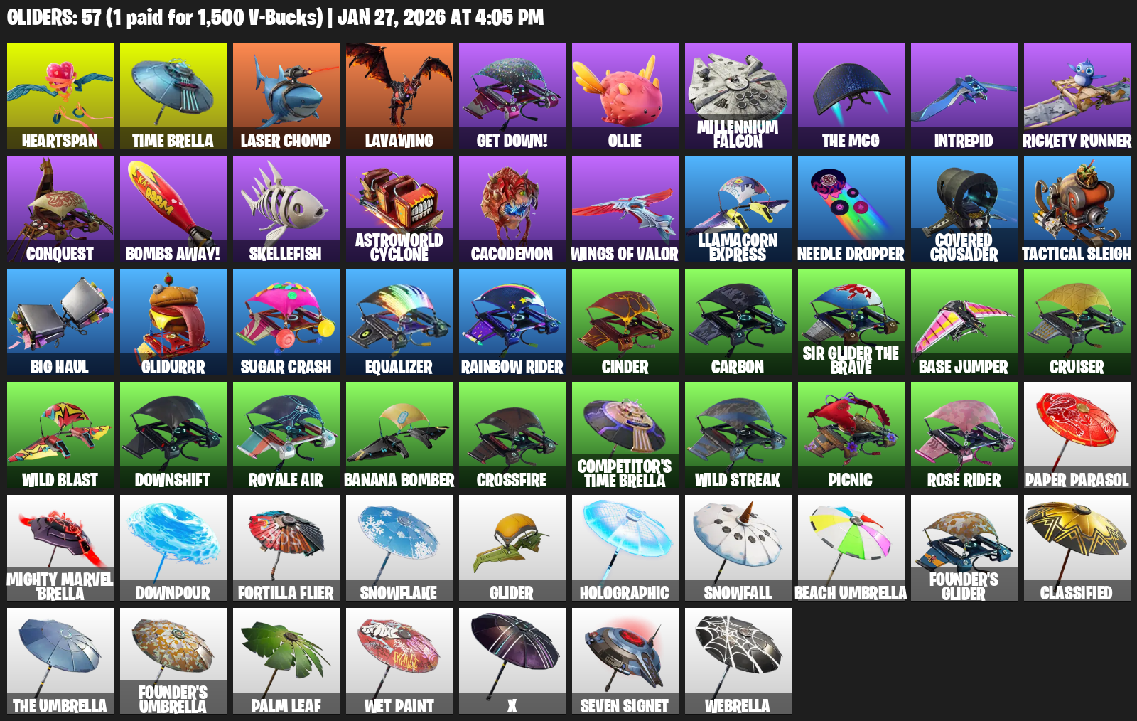 Heartspan, Time Brella, Laser Chomp, Lavawing, Ollie, Millennium Falcon, Intrepid, Rickety Runner, Conquest, Bombs Away!, Skellefish, Astroworld Cyclone, Cacodemon, Llamacorn Express, Needle Dropper, Covered Crusader, Tactical Sleigh