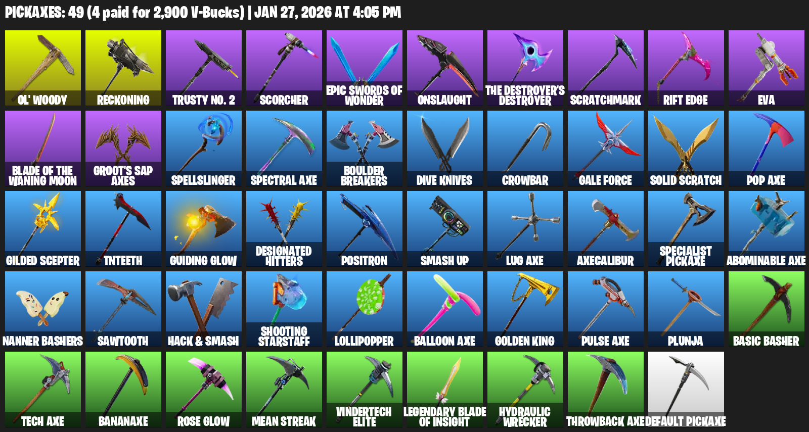 Ol’ Woody, Reckoning, Trusty No. 2, Scorcher, Onslaught, Scratchmark, Rift Edge, EVA, Groot’s Sap Axes, Spellslinger, Spectral Axe, Boulder Breakers, Dive Knives, Crowbar, Gale Force, Solid Scratch