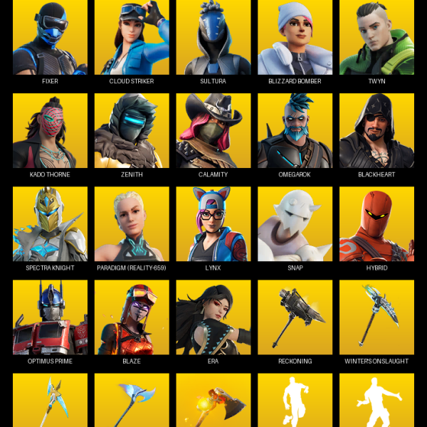 The Reaper, Royale Knight, Blue Squire, Elite Agent, Omega, Gear Specialist Maya, Rose Team Leader, Warpaint, Drift, Zenith, Lynx, Ravage, Carbide, Molten Battle Hound, Calamity, Valor, Midas, Hime