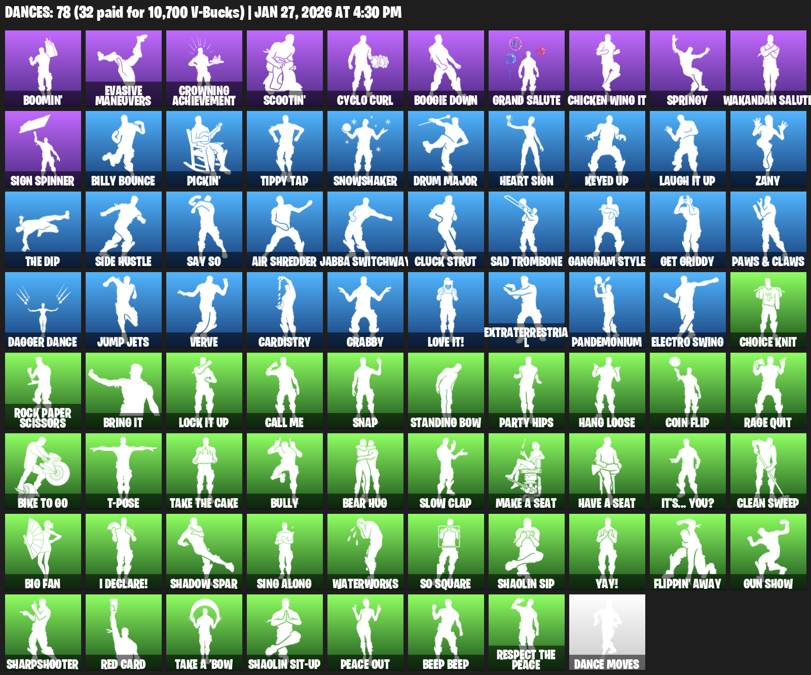 Boomin’, Evasive Maneuvers, Crowning Achievement, Scootin’, Cyclo Curl, Boogie Down, Grand Salute, Chicken Wing It, Springy, Sign Spinner, Billy Bounce, Pickin’, Tippy Tap, Snowshaker, Drum Major, Keyed Up, Zany