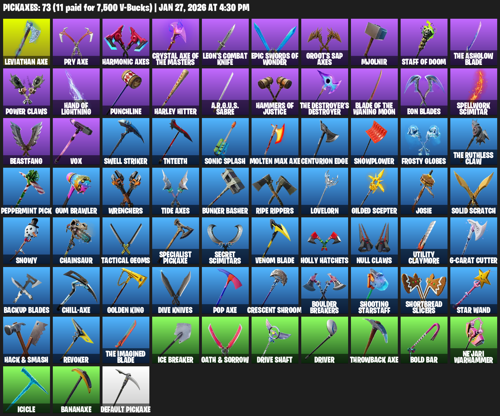 Leviathan Axe, Harmonic Axes, Leon’s Combat Knife, Mjolnir, Staff of Doom, The Ashglow Blade, Power Claws, Punchline, Harley Hitter, A.R.G.U.S. Sabre, Eon Blades, Spellwork Scimitar