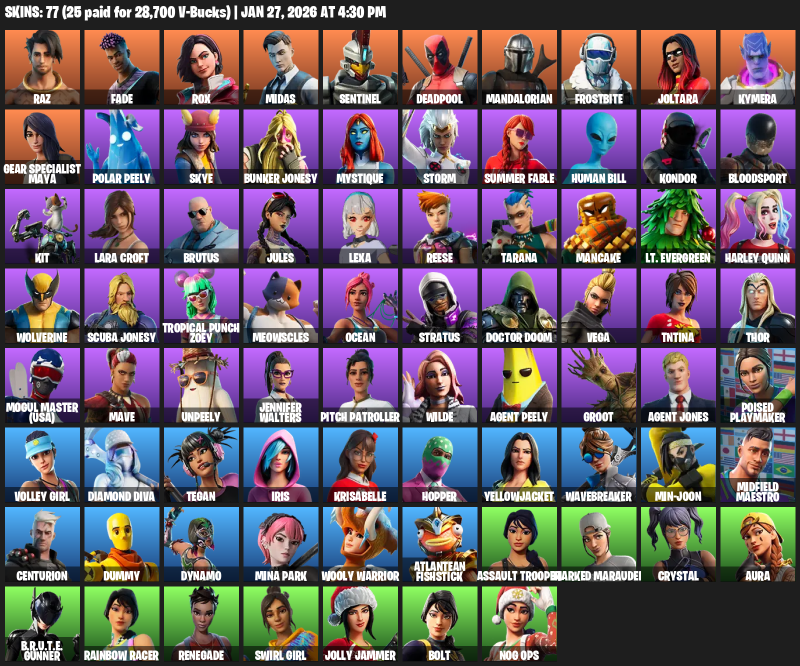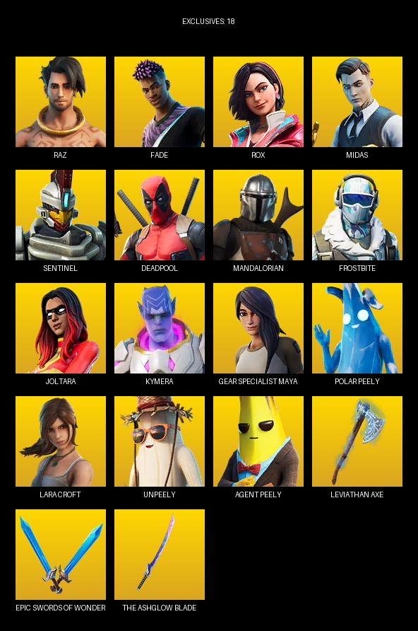 Gear Specialist Maya, Lara Croft, Raz, Fade, Rox, Midas, Sentinel, Deadpool, Mandalorian, Frostbite, Joltara, Kymera, Polar Peely, Skye, Bunker Jonesy, Mystique, Storm, Summer Fable, Human Bill, Kondor