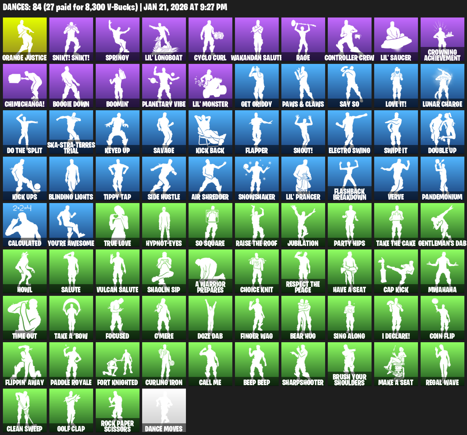 Orange Justice, Snikt! Snikt!, Springy, Lil’ Longboat, Cyclo Curl, Wakandan Salute, Rage, Controller Crew, Crowning Achievement, Chimichanga!, Boogie Down, Boomin’, Planetary Vibe, Get Griddy, Say So, Love it!, Lunar Charge