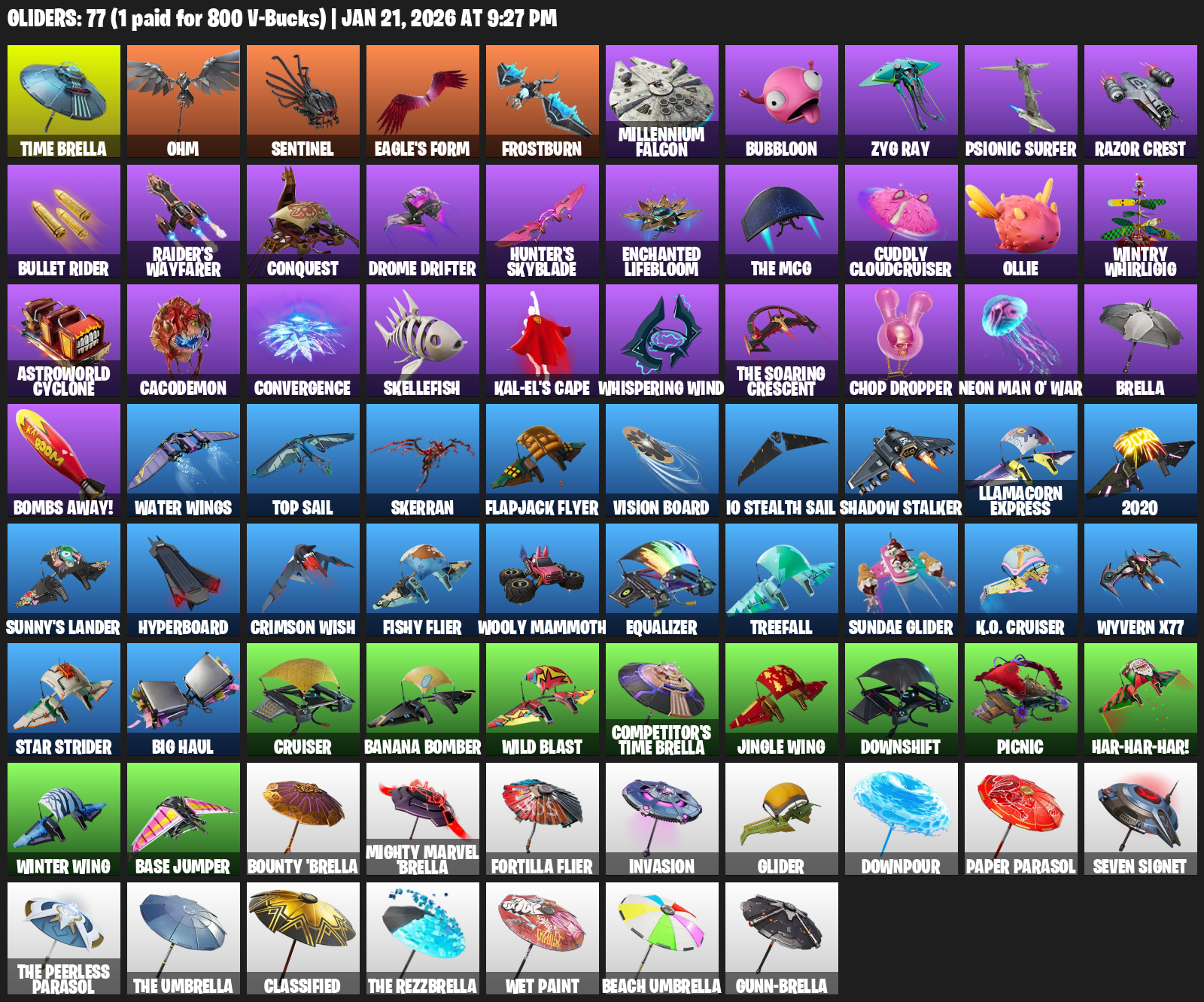 Time Brella, Ohm, Sentinel, Eagle’s Form, Frostburn, Millennium Falcon, Bubbloon, Zyg Ray, Psionic Surfer, Razor Crest, Bullet Rider, Raider’s Wayfarer, Conquest, Drome Drifter, Hunter’s Skyblade, Enchanted Lifebloom, Cuddly Cloudcruiser, Ollie, Wintry Whirligig