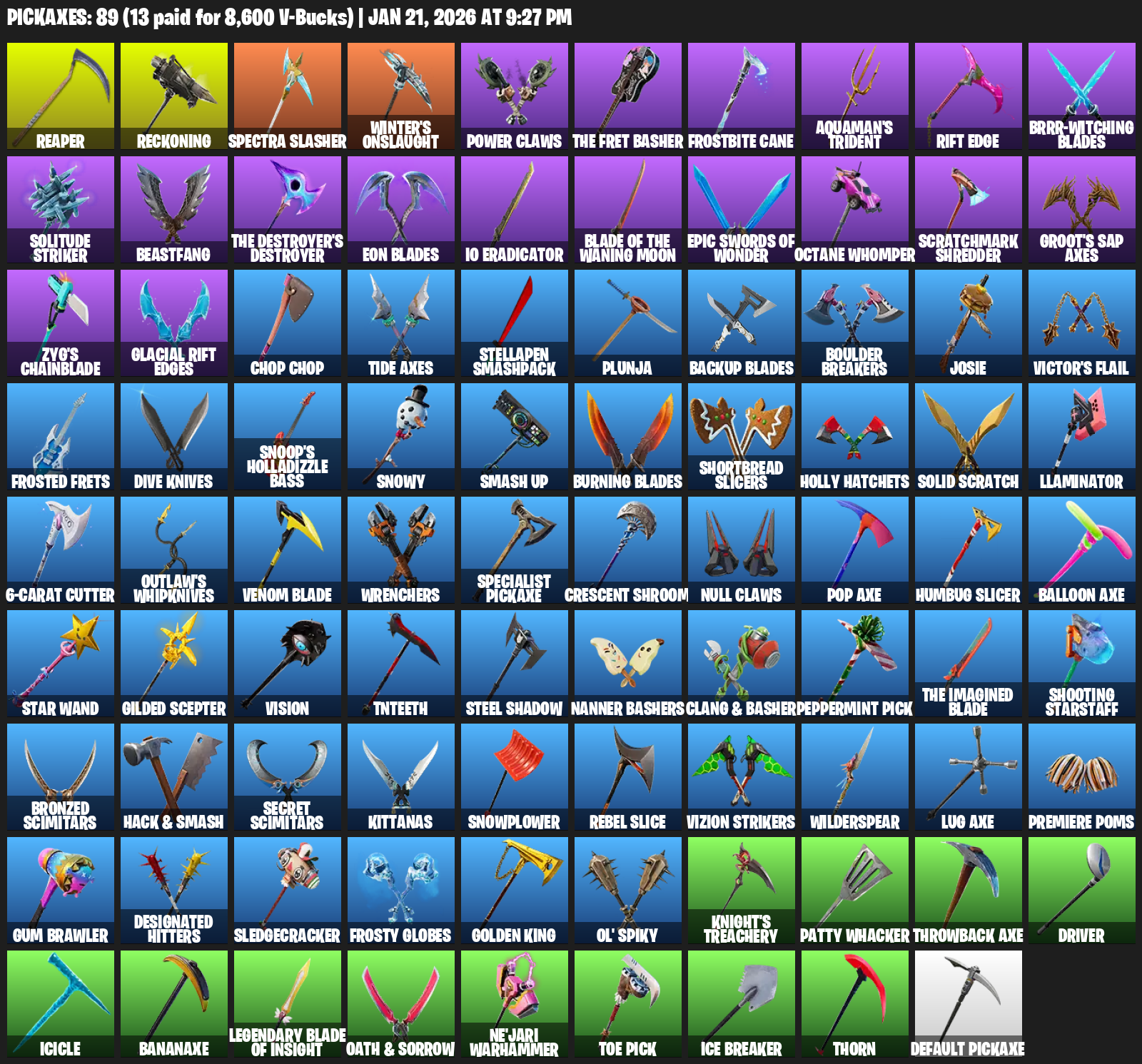 Reaper, Reckoning, Spectra Slasher, Winter’s Onslaught, Power Claws, The Fret Basher, Frostbite Cane, Aquaman’s Trident, Rift Edge, Brrr-witching Blades, Solitude Striker, Beastfang, IO Eradicator, Octane Whomper, Scratchmark Shredder, Groot’s Sap Axes