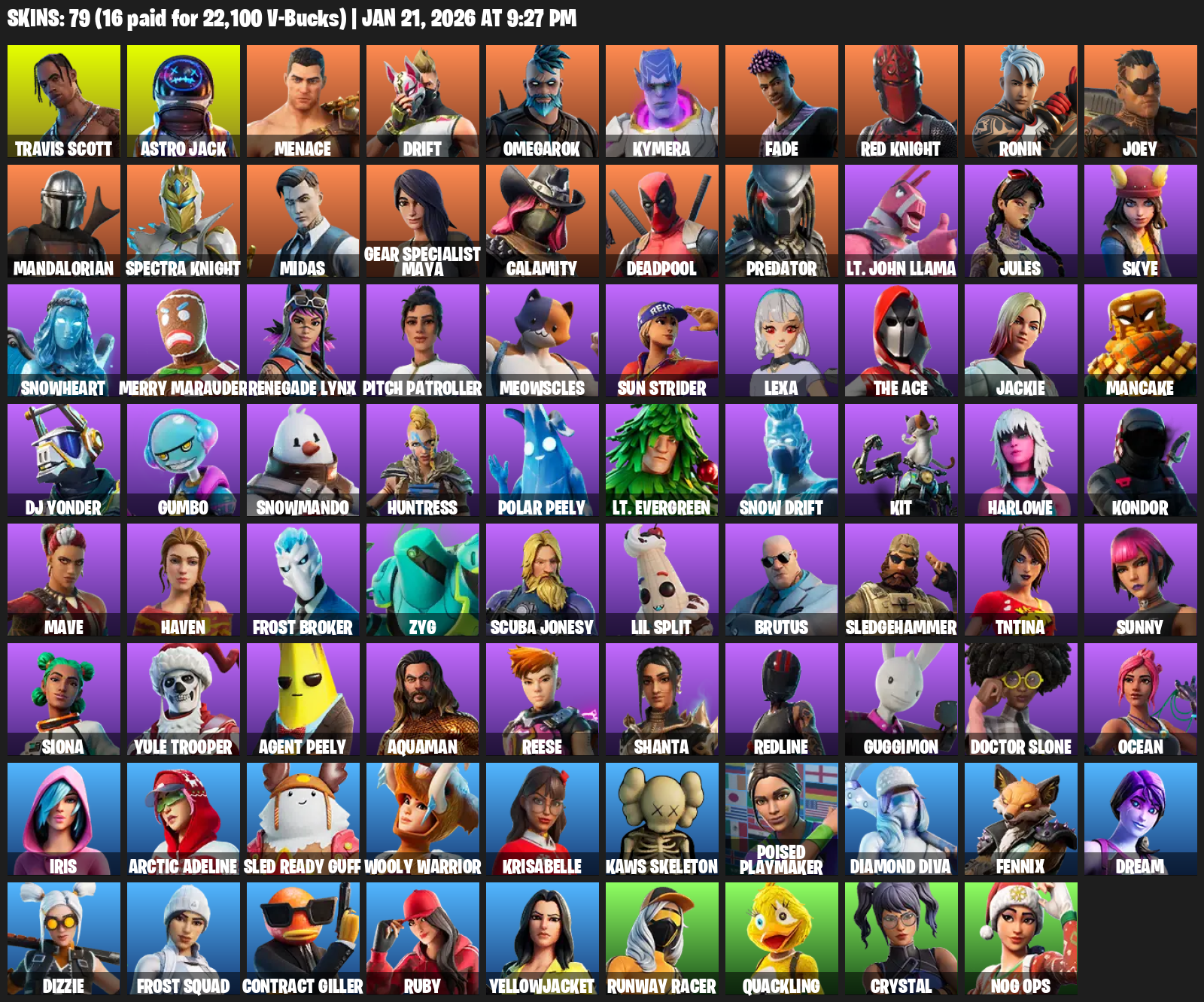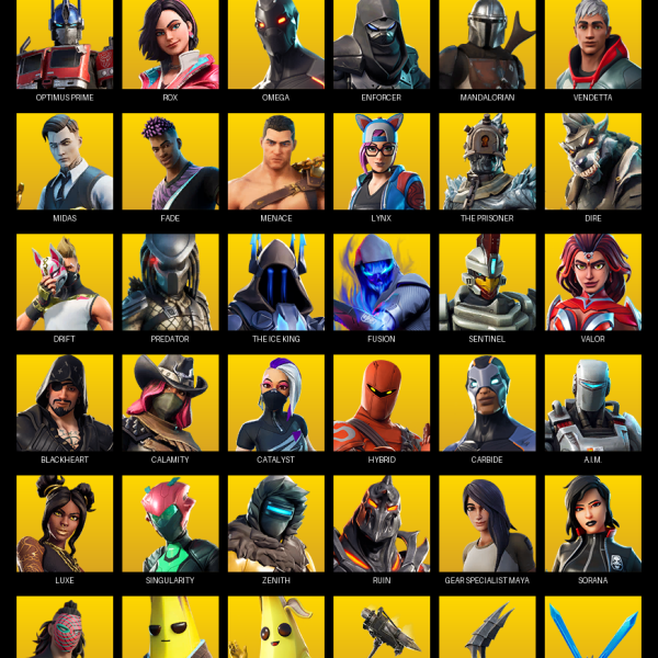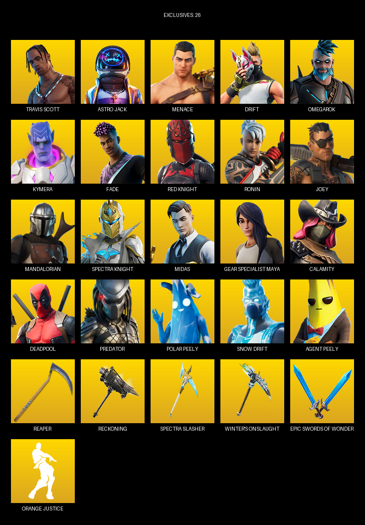 Travis Scott, Gear Specialist Maya, Astro Jack, Menace, Drift, Omegarok, Kymera, Fade, Red Knight, Ronin, Joey, Mandalorian, Midas, Calamity, Deadpool, Predator, Lt. John Llama, Jules, Skye