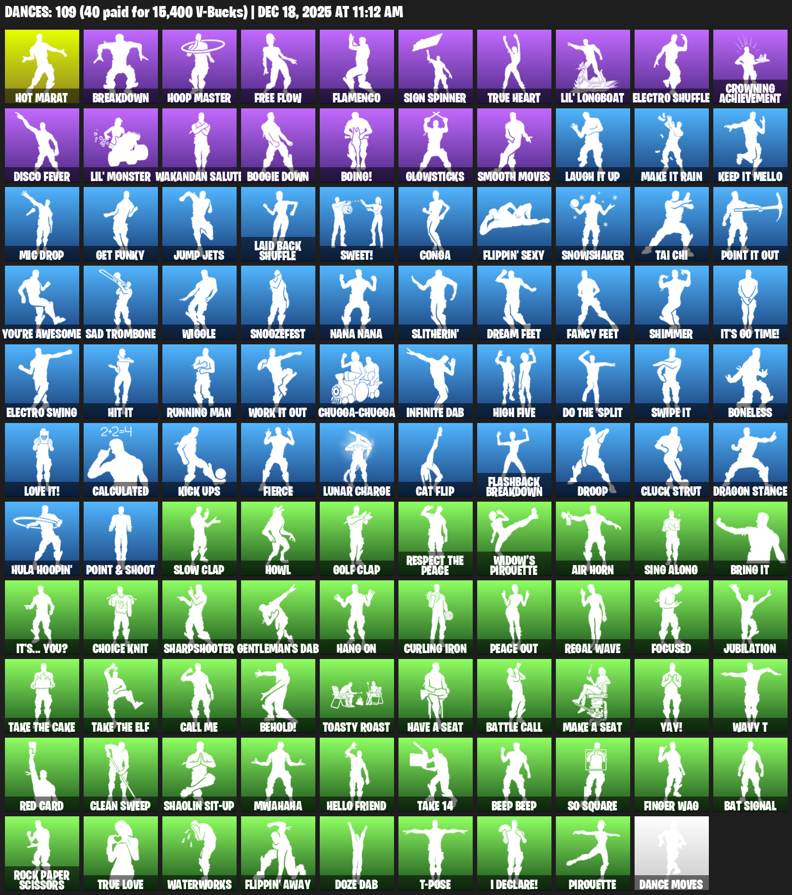 Hot Marat, Breakdown, Hoop Master, Free Flow, Flamenco, Sign Spinner, True Heart, Lil’ Longboat, Electro Shuffle, Crowning Achievement, Disco Fever, Wakandan Salute, Boogie Down, Boing!, Glowsticks, Smooth Moves, Laugh It Up