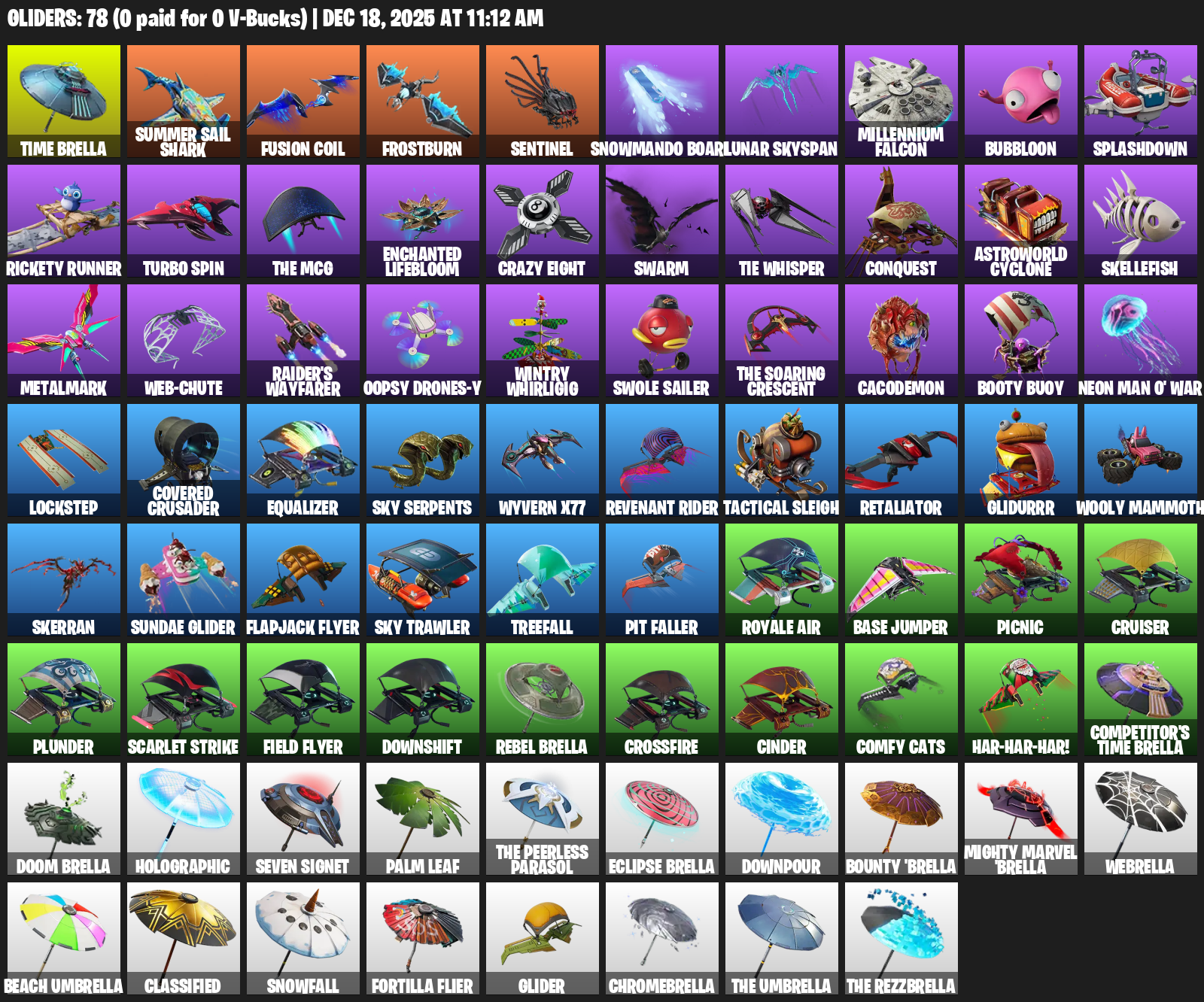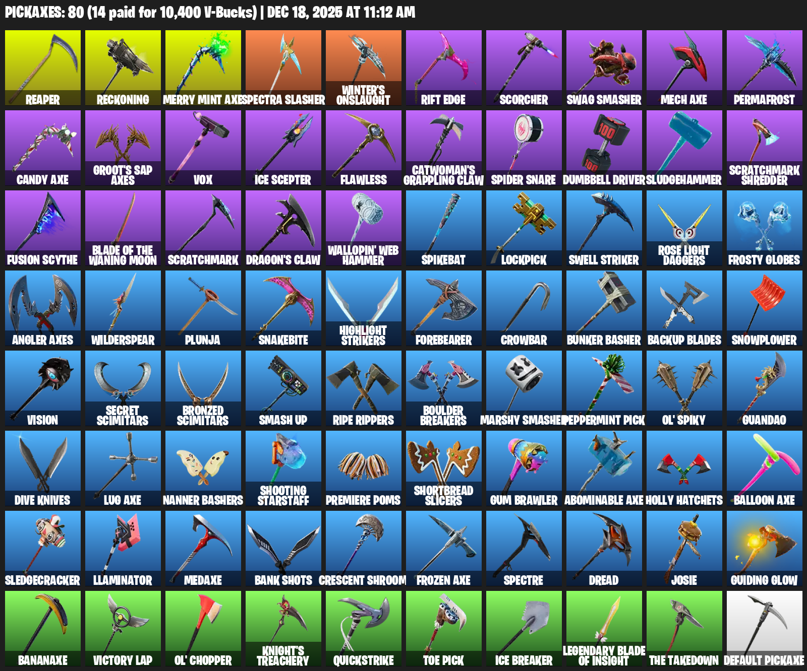 Merry Mint Axe, Reaper, Reckoning, Winter’s Onslaught, Rift Edge, Scorcher, Swag Smasher, Permafrost, Groot’s Sap Axes, Vox, Ice Scepter, Flawless, Catwoman’s Grappling Claw, Spider Snare, Dumbbell Driver, Sludgehammer, Scratchmark Shredder