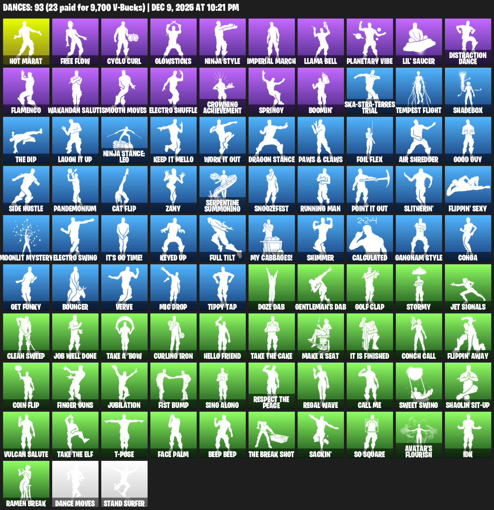 Hot Marat, Free Flow, Cyclo Curl, Glowsticks, Ninja Style, Imperial March, Llama Bell, Planetary Vibe, Lil’ Saucer, Distraction Dance, Flamenco, Wakandan Salute, Smooth Moves, Electro Shuffle, Crowning Achievement, Springy, Boomin’, Ska-stra-terrestrial, Tempest Flight, Shadebox