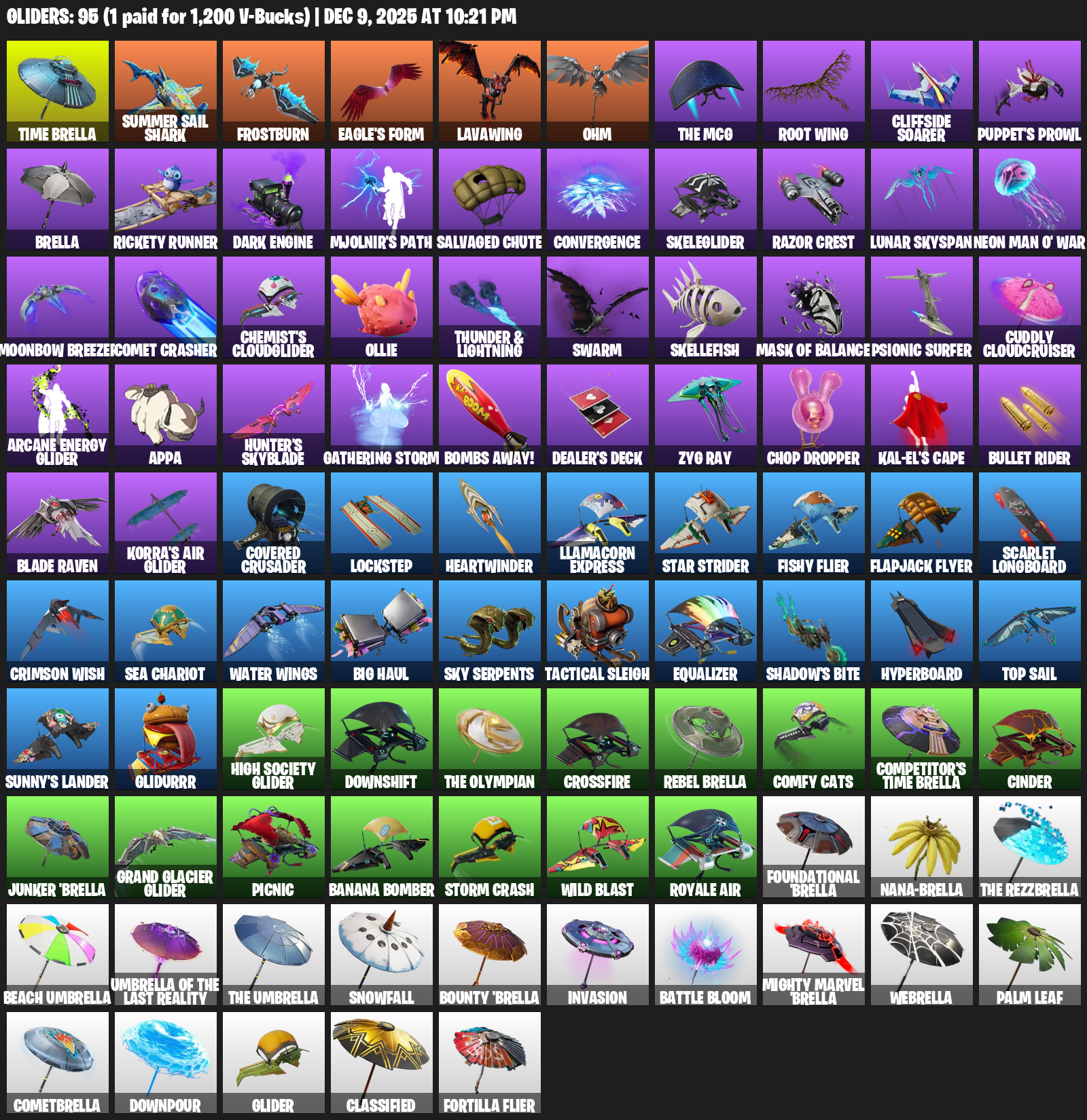 Time Brella, Summer Sail Shark, Frostburn, Eagle’s Form, Lavawing, Ohm, Root Wing, Cliffside Soarer, Puppet’s Prowl, Rickety Runner, Dark Engine, Mjolnir’s Path, Salvaged Chute, Convergence, Skeleglider, Razor Crest, Lunar Skyspan, Neon Man O’ War