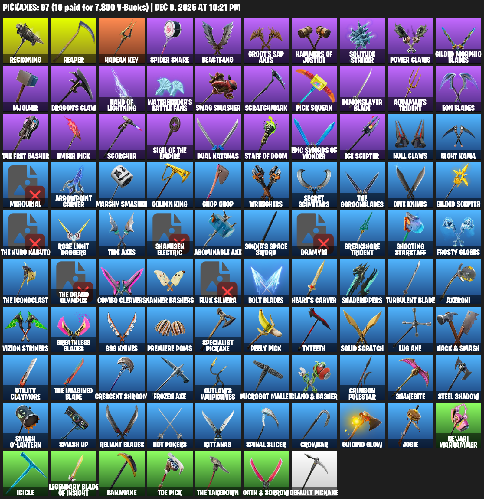 Reckoning, Reaper, Hadean Key, Spider Snare, Beastfang, Groot’s Sap Axes, Hammers of Justice, Solitude Striker, Power Claws, Gilded Morphic Blades, Mjolnir, Dragon’s Claw, Waterbender’s Battle Fans, Swag Smasher, Scratchmark, Pick Squeak, Demonslayer Blade, Aquaman’s Trident