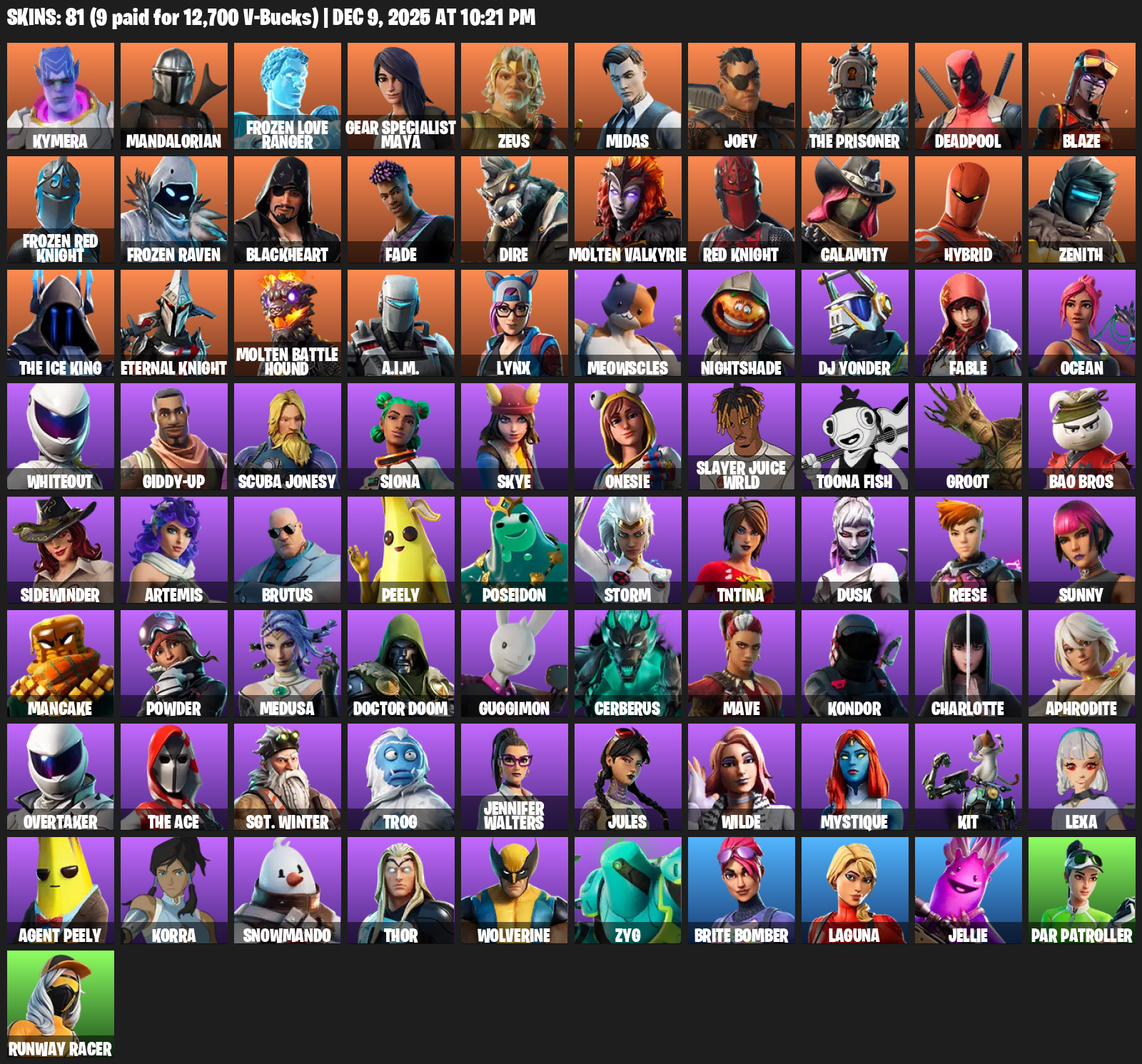 Gear Specialist Maya, Kymera, Mandalorian, Frozen Love Ranger, Zeus, Midas, Joey, The Prisoner, Deadpool, Blaze, Blackheart, Fade, Dire, Molten Valkyrie, Red Knight, Calamity, Hybrid, Zenith