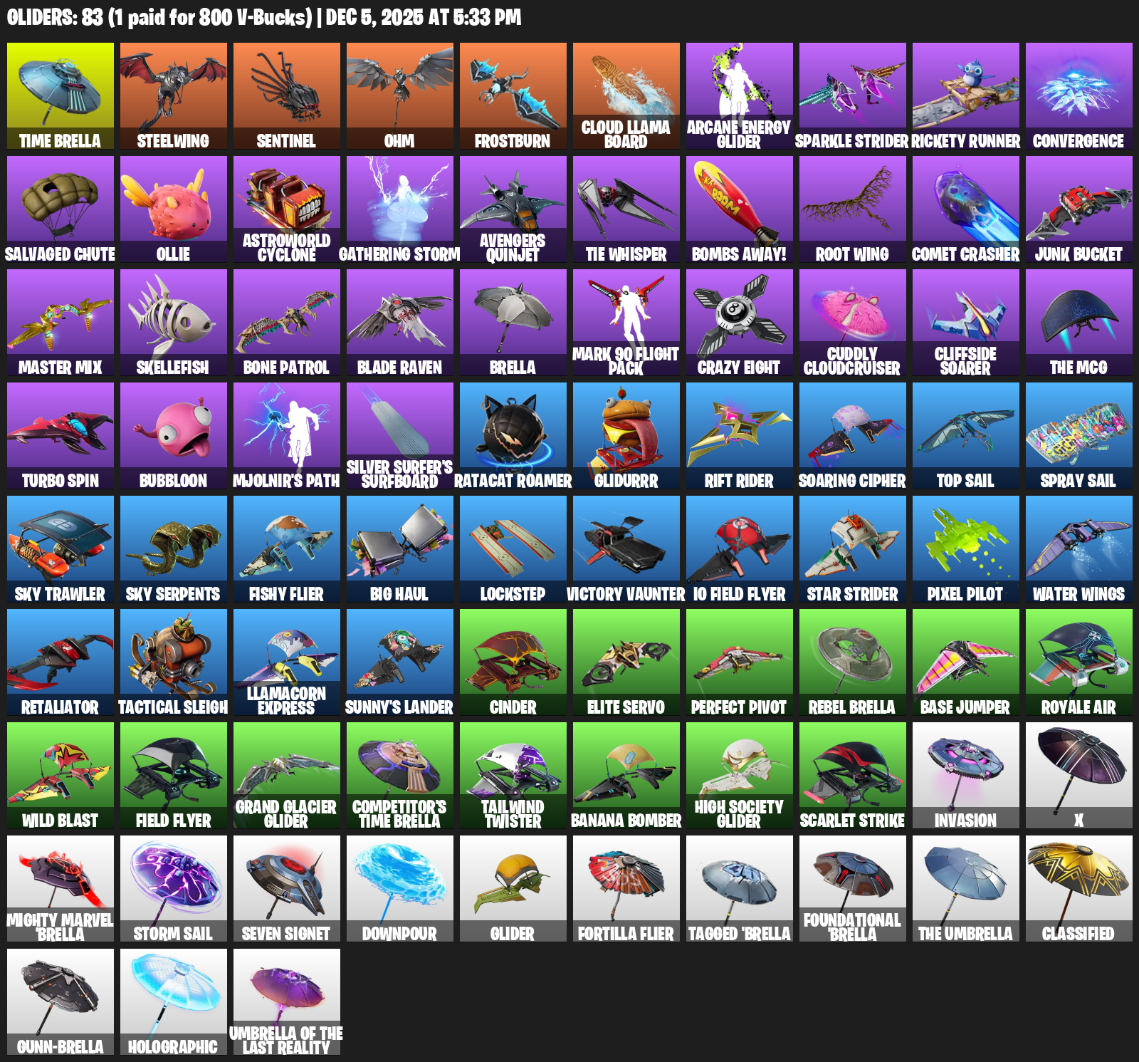 Time Brella, Steelwing, Sentinel, Ohm, Frostburn, Cloud Llama Board, Sparkle Strider, Rickety Runner, Convergence, Salvaged Chute, Ollie, Astroworld Cyclone, Gathering Storm, Avengers Quinjet, TIE Whisper, Bombs Away!, Root Wing, Comet Crasher, Junk Bucket