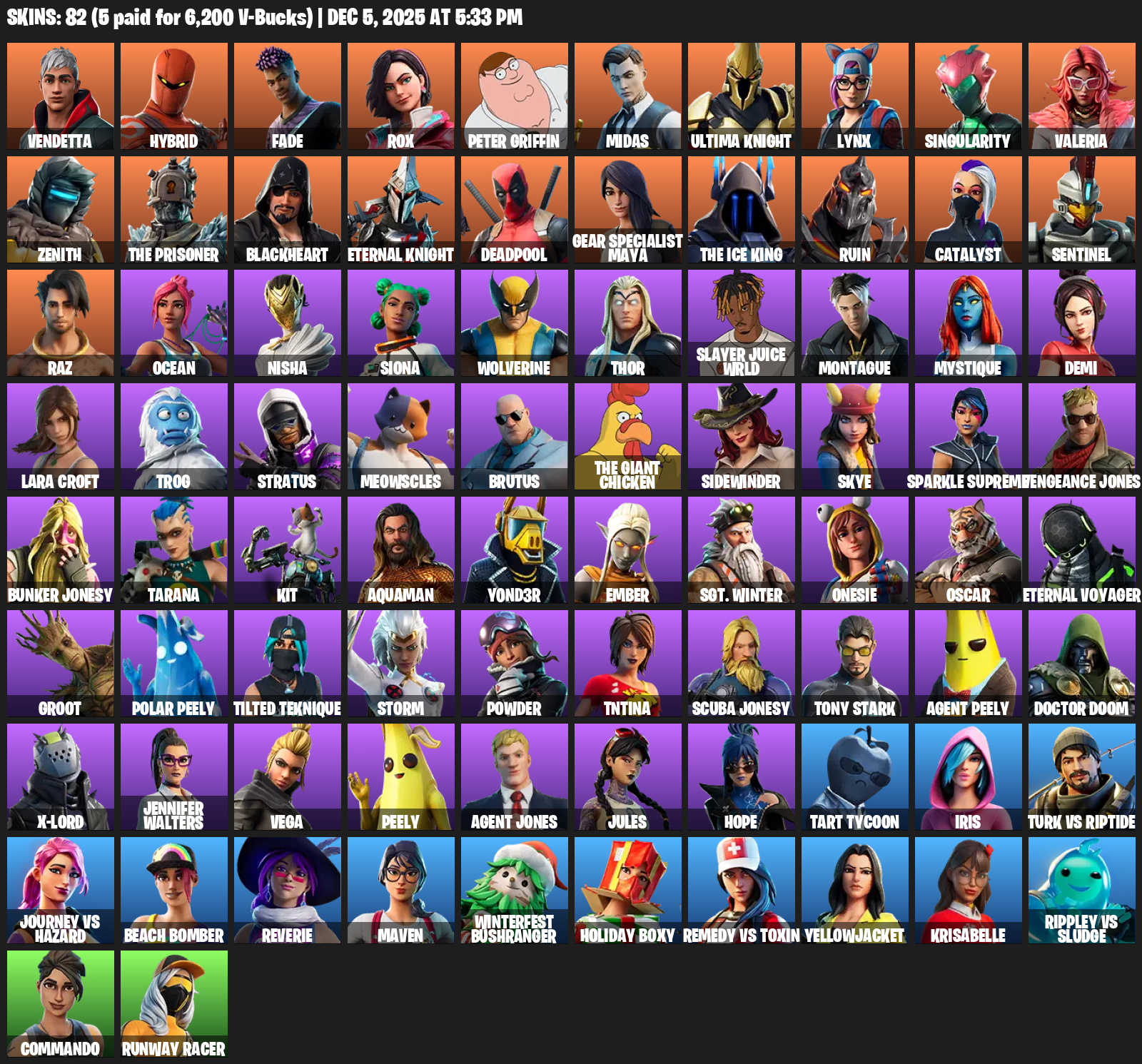 Gear Specialist Maya, Lara Croft, Vendetta, Hybrid, Fade, Rox, Peter Griffin, Midas, Ultima Knight, Lynx, Singularity, Valeria, Zenith, The Prisoner, Blackheart, Deadpool, Ruin, Catalyst