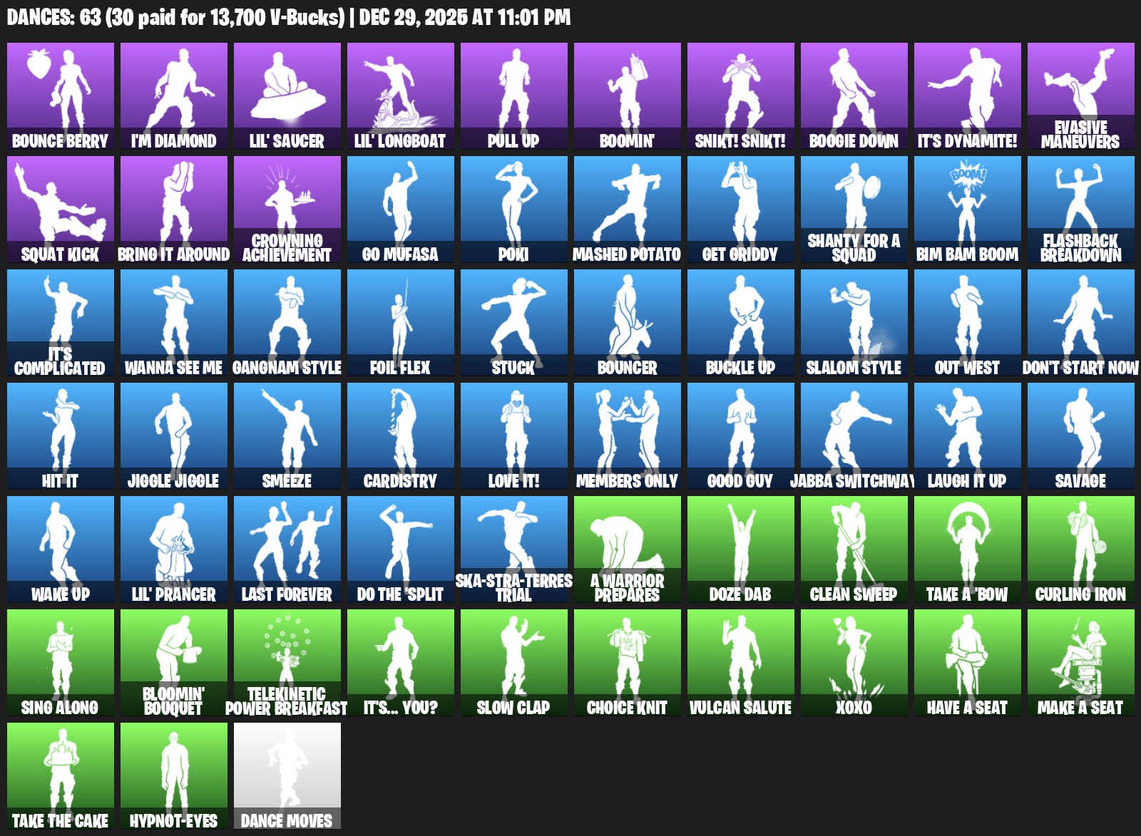 Bounce Berry, I’m Diamond, Lil’ Saucer, Pull Up, Boomin’, Snikt! Snikt!, Boogie Down, It’s Dynamite!, Evasive Maneuvers, Squat Kick, Bring it around, Crowning Achievement, Go Mufasa, Poki, Mashed Potato, Get Griddy, Shanty for a Squad, Bim Bam Boom, Flashback Breakdown