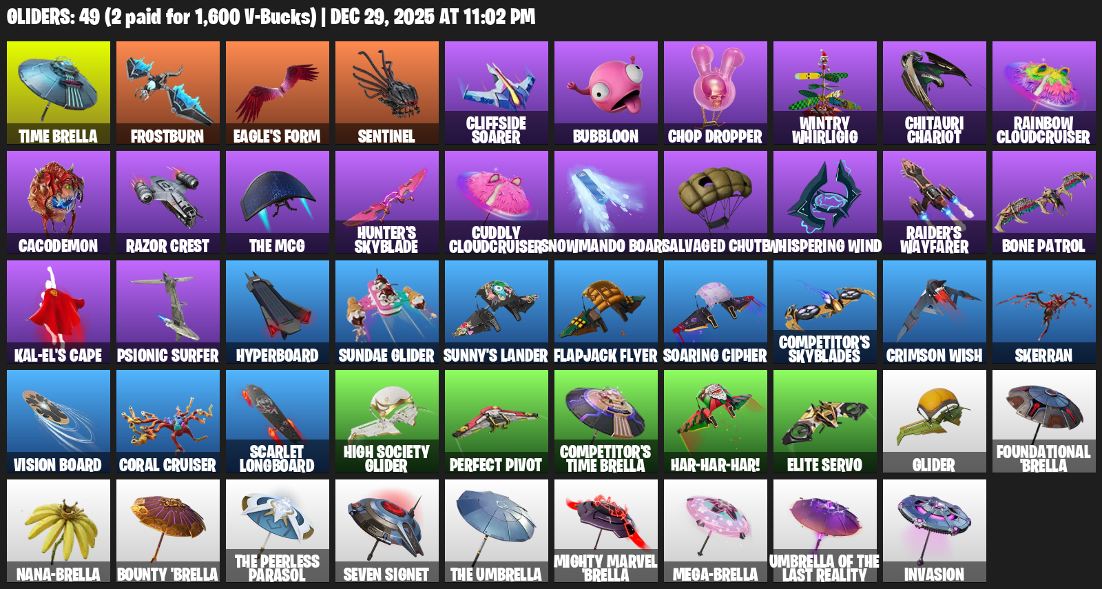 Time Brella, Frostburn, Eagle’s Form, Sentinel, Cliffside Soarer, Bubbloon, Chop Dropper, Wintry Whirligig, Chitauri Chariot, Rainbow Cloudcruiser, Cacodemon, Razor Crest, Hunter’s Skyblade, Snowmando Board, Salvaged Chute, Whispering Wind, Raider’s Wayfarer, Bone Patrol