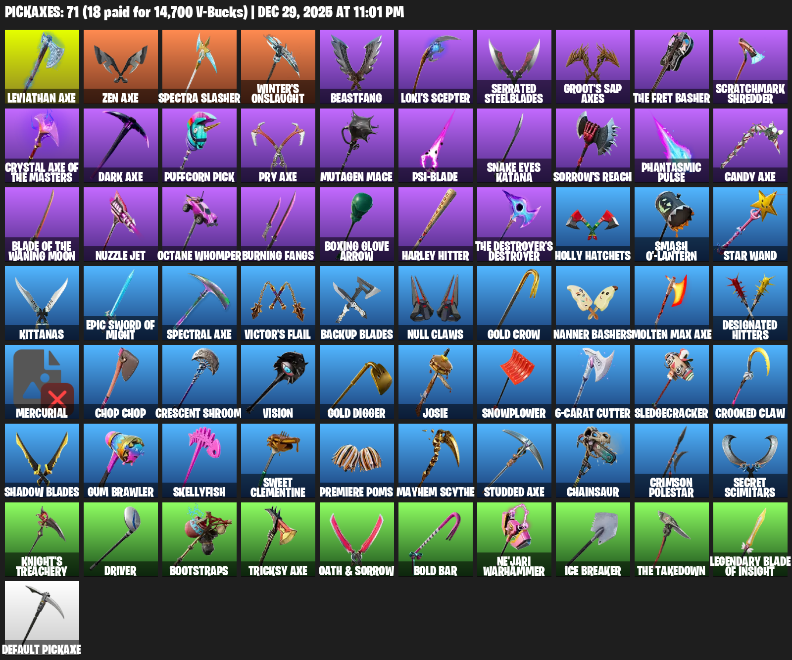 Leviathan Axe, Winter’s Onslaught, Beastfang, Loki’s Scepter, Serrated Steelblades, Groot’s Sap Axes, The Fret Basher, Scratchmark Shredder, Puffcorn Pick, Mutagen Mace, Psi-blade, Snake Eyes Katana, Sorrow’s Reach, Phantasmic Pulse