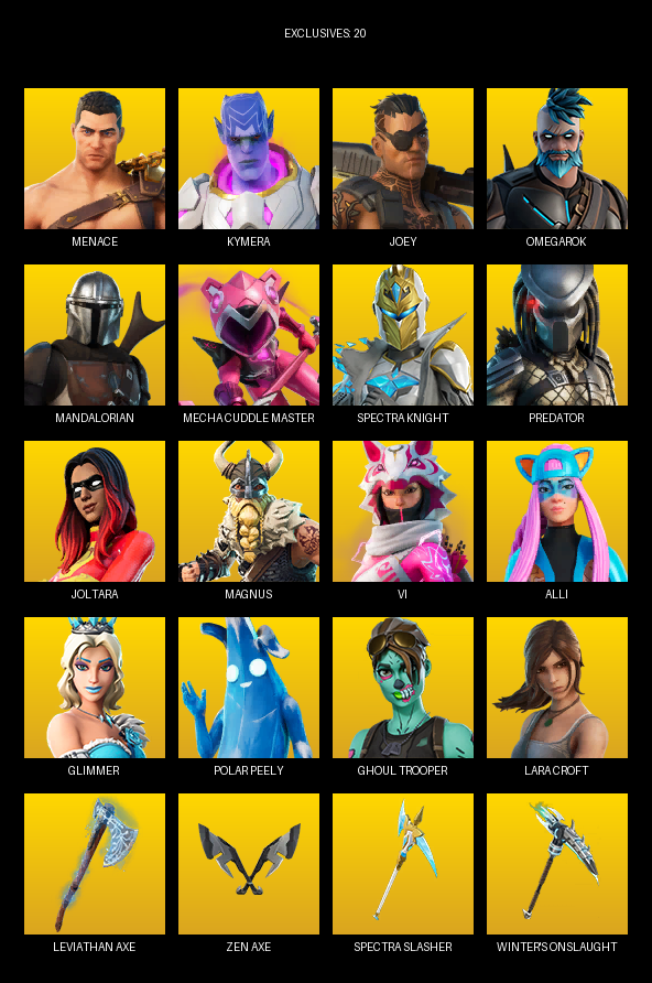 Lara Croft, Menace, Kymera, Joey, Omegarok, Mandalorian, Mecha Cuddle Master, Spectra Knight, Predator, Joltara, Magnus, Vi, Alli, Glimmer, Kondor, Lovethorn, Polar Peely, Sakura Haruno, Ghoul Trooper, Lil Split