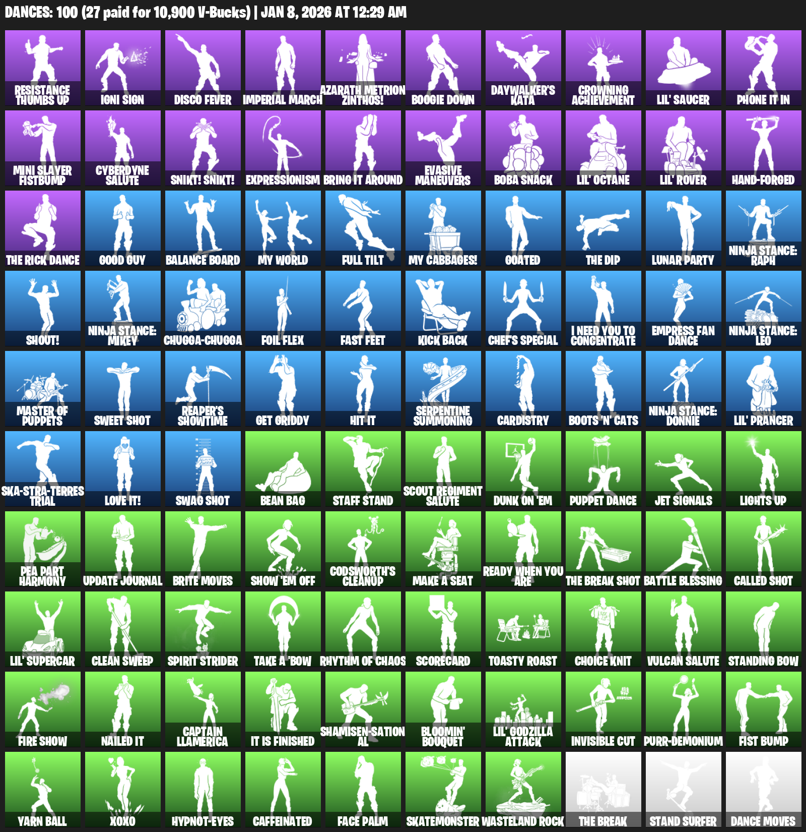 Resistance Thumbs Up, Igni Sign, Disco Fever, Imperial March, Azarath Metrion Zinthos!, Boogie Down, Daywalker’s Kata, Crowning Achievement, Lil’ Saucer, Phone It In, Mini Slayer Fistbump, Cyberdyne Salute, Snikt! Snikt!, Expressionism, Evasive Maneuvers, Boba Snack, Hand-Forged