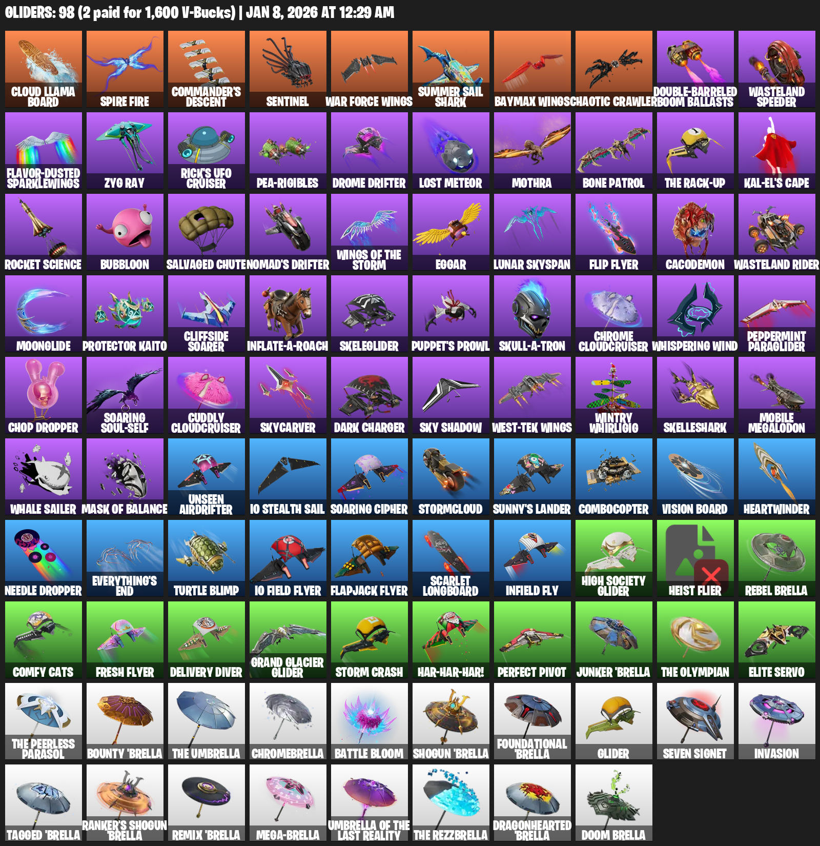 Cloud Llama Board, Commander’s Descent, Sentinel, War Force Wings, Summer Sail Shark, Chaotic Crawler, Double-Barreled Boom Ballasts, Wasteland Speeder, Flavor-Dusted Sparklewings, Zyg Ray, Rick’s UFO Cruiser, Pea-rigibles, Drome Drifter, Lost Meteor, Mothra, Bone Patrol, Kal-El’s Cape