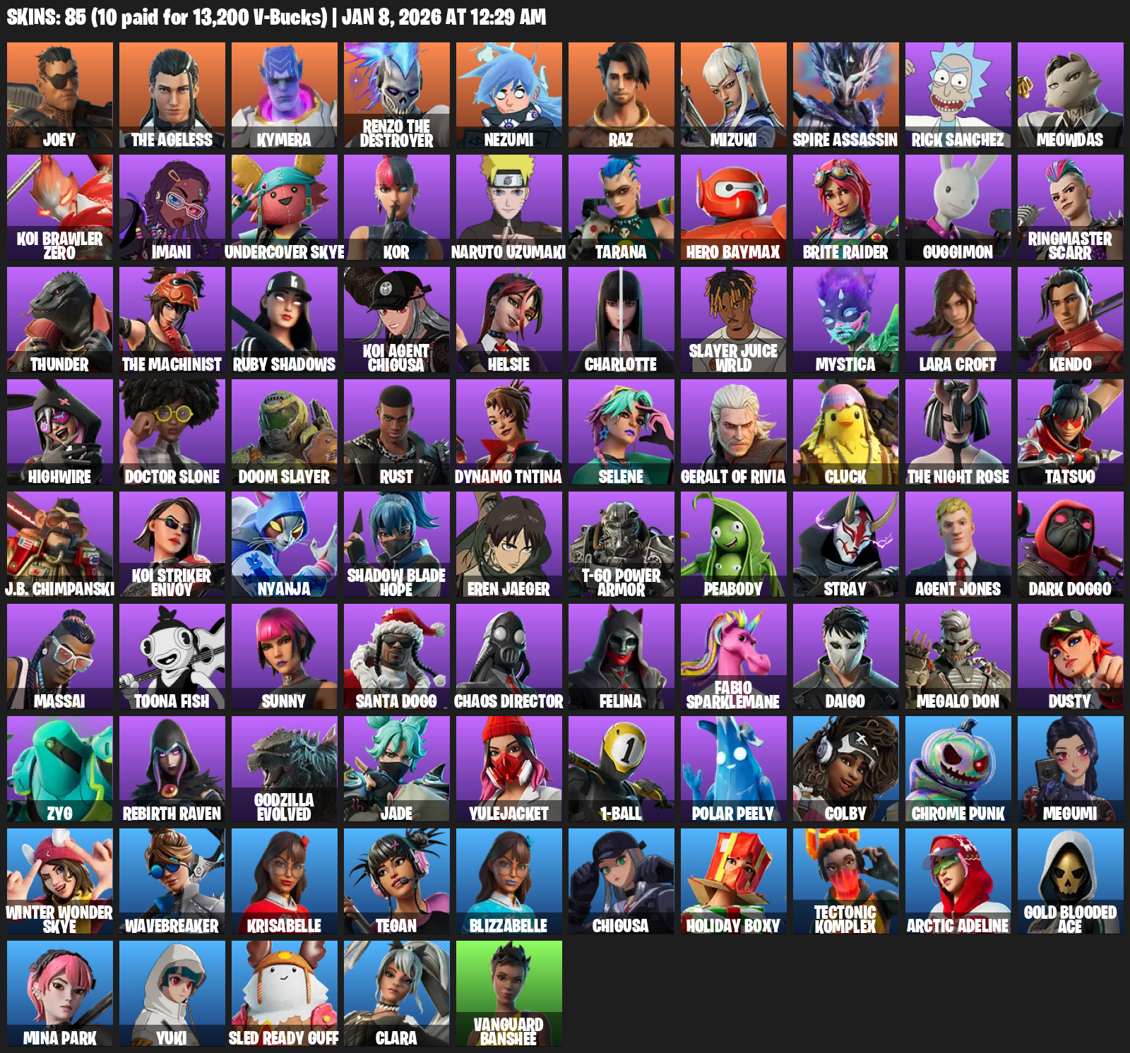 [PC/PSN] | 85 skins | 600 V-bucks | Lara Croft | Joey | The Ageless | Kymera | Renzo the Destroyer | Nezumi | Raz | Mizuki | Spire Assassin | #HBR9184
