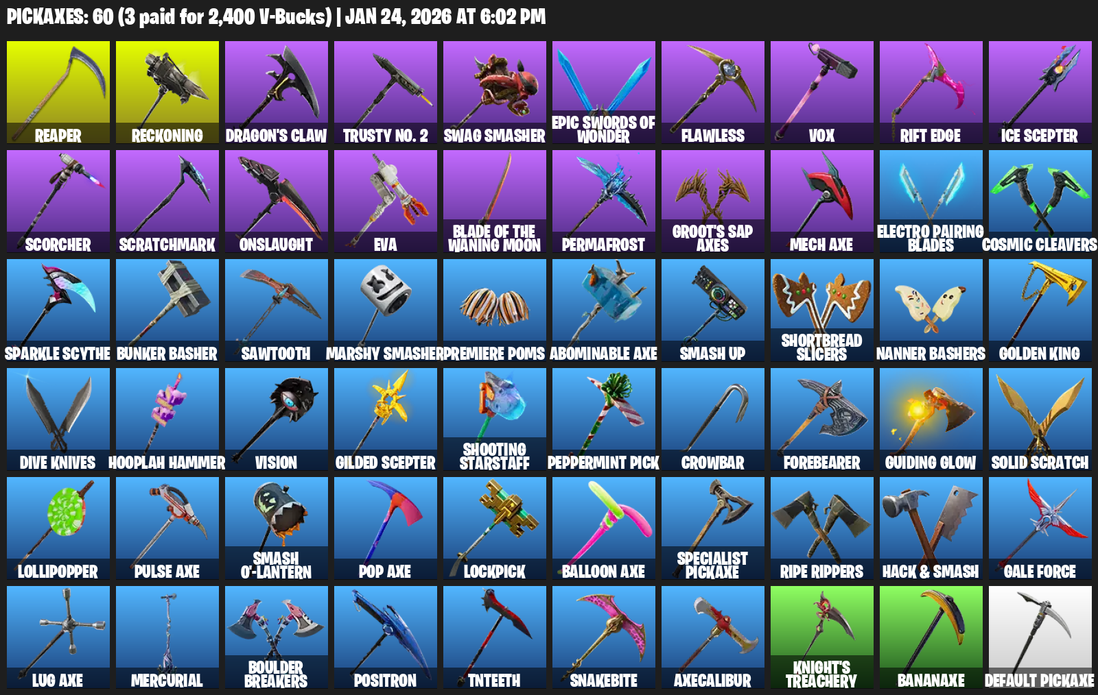 Reckoning, Dragon’s Claw, Trusty No. 2, Swag Smasher, Flawless, Vox, Rift Edge, Ice Scepter, Scorcher, Scratchmark, Onslaught, EVA, Permafrost, Groot’s Sap Axes, Mech Axe, Electro Pairing Blades, Cosmic Cleavers