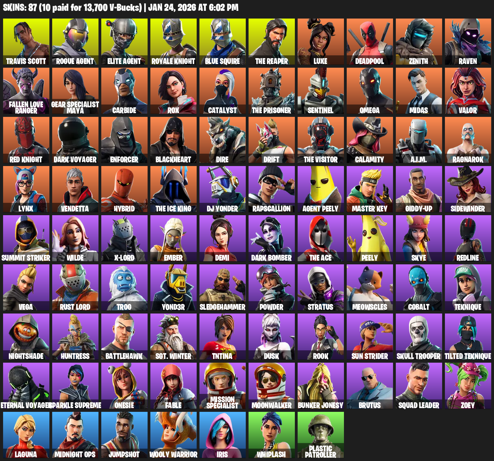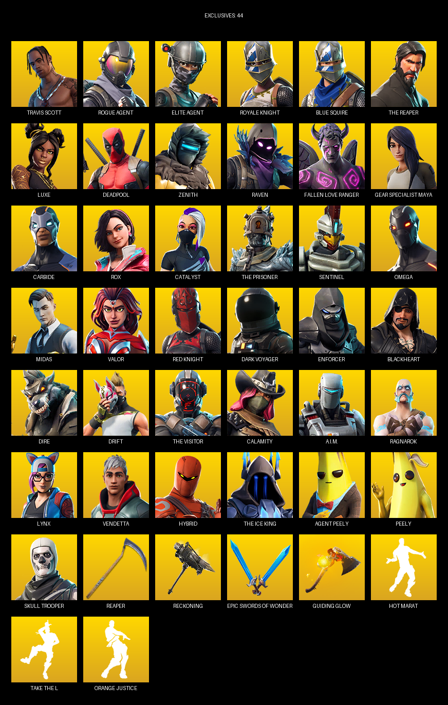 Travis Scott, Elite Agent, Royale Knight, Blue Squire, The Reaper, Gear Specialist Maya, Omega, Luxe, Deadpool, Zenith, Raven, Fallen Love Ranger, Carbide, Rox, Catalyst, Sentinel, Midas, Valor