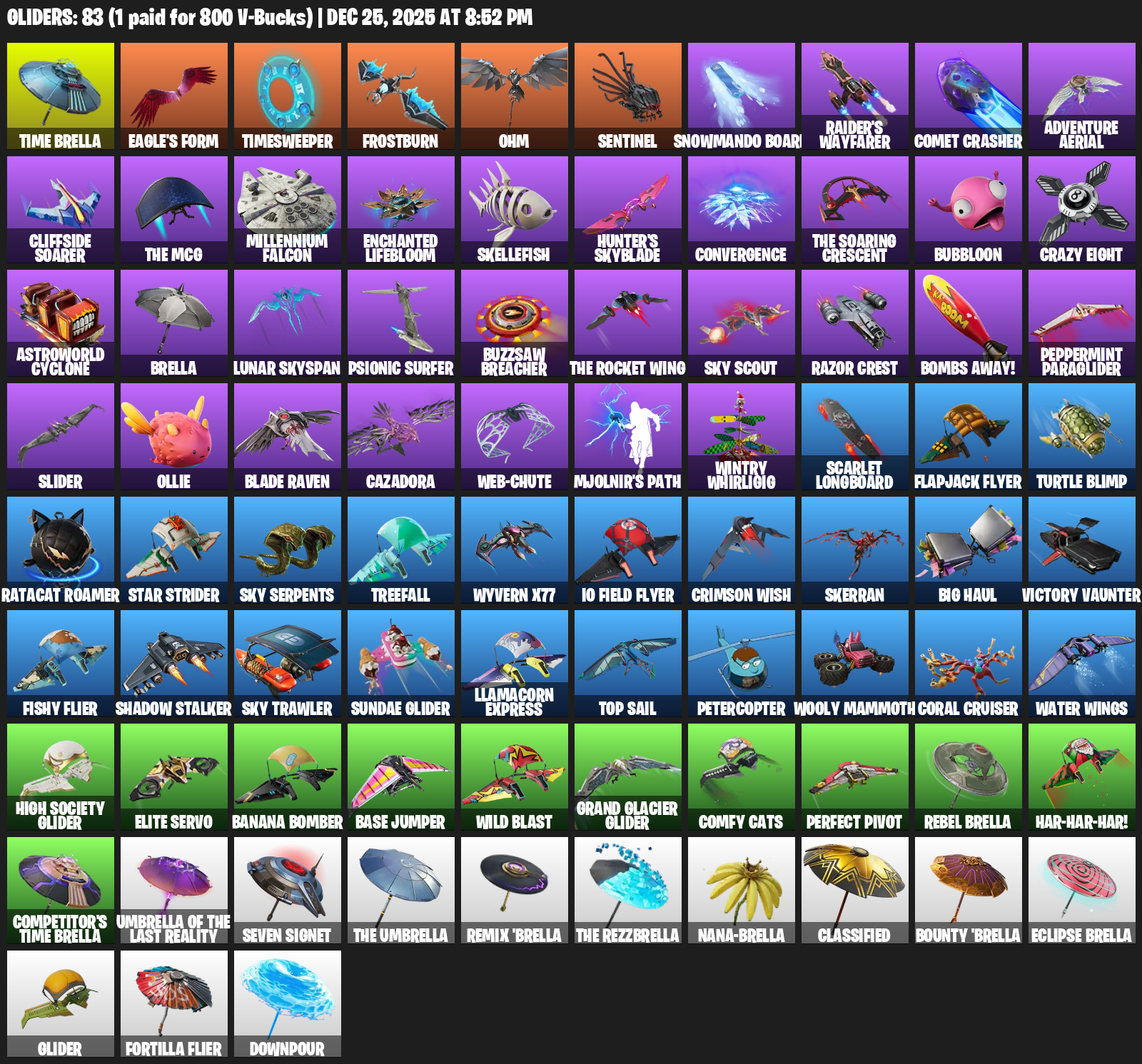 Time Brella, Eagle’s Form, Timesweeper, Frostburn, Ohm, Sentinel, Snowmando Board, Raider’s Wayfarer, Comet Crasher, Adventure Aerial, Cliffside Soarer, Millennium Falcon, Enchanted Lifebloom, Skellefish, Convergence, Bubbloon, Crazy Eight