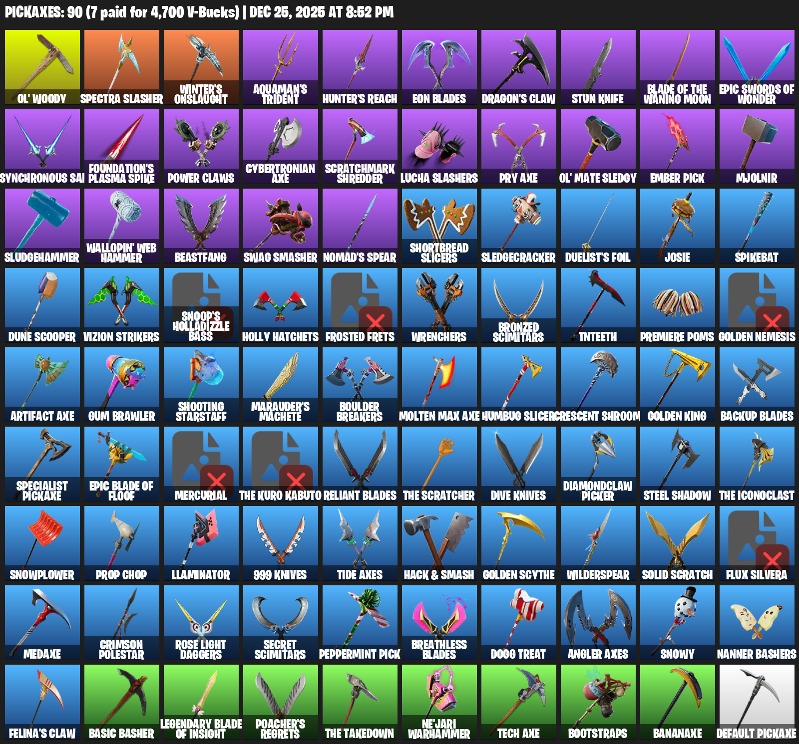 Ol’ Woody, Spectra Slasher, Winter’s Onslaught, Aquaman’s Trident, Hunter’s Reach, Eon Blades, Dragon’s Claw, Stun Knife, Synchronous Sai, Foundation’s Plasma Spike, Power Claws, Cybertronian Axe, Scratchmark Shredder, Lucha Slashers, Ember Pick, Mjolnir