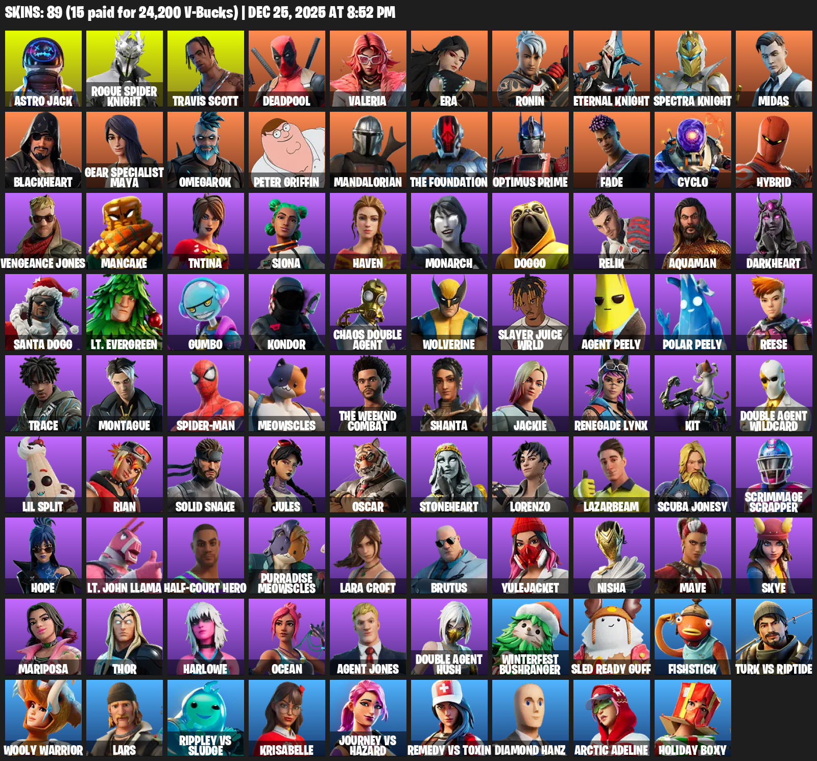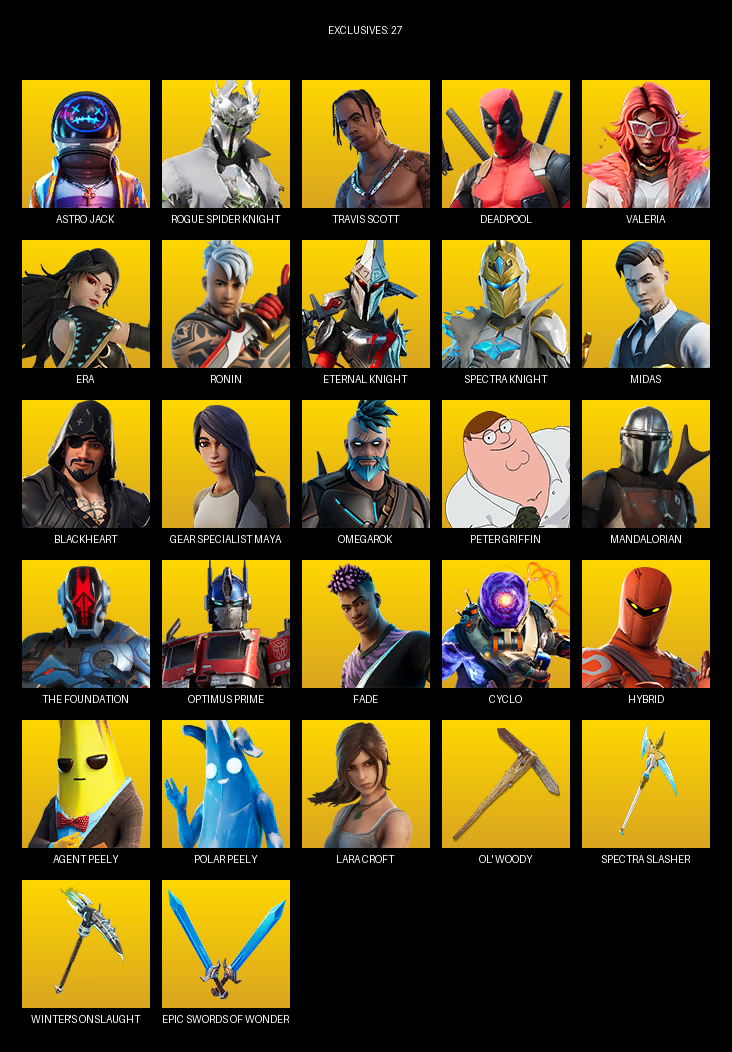 Travis Scott, Gear Specialist Maya, Lara Croft, Astro Jack, Rogue Spider Knight, Deadpool, Valeria, Era, Ronin, Midas, Blackheart, Omegarok, Peter Griffin, Mandalorian, The Foundation, Optimus Prime, Fade, Cyclo