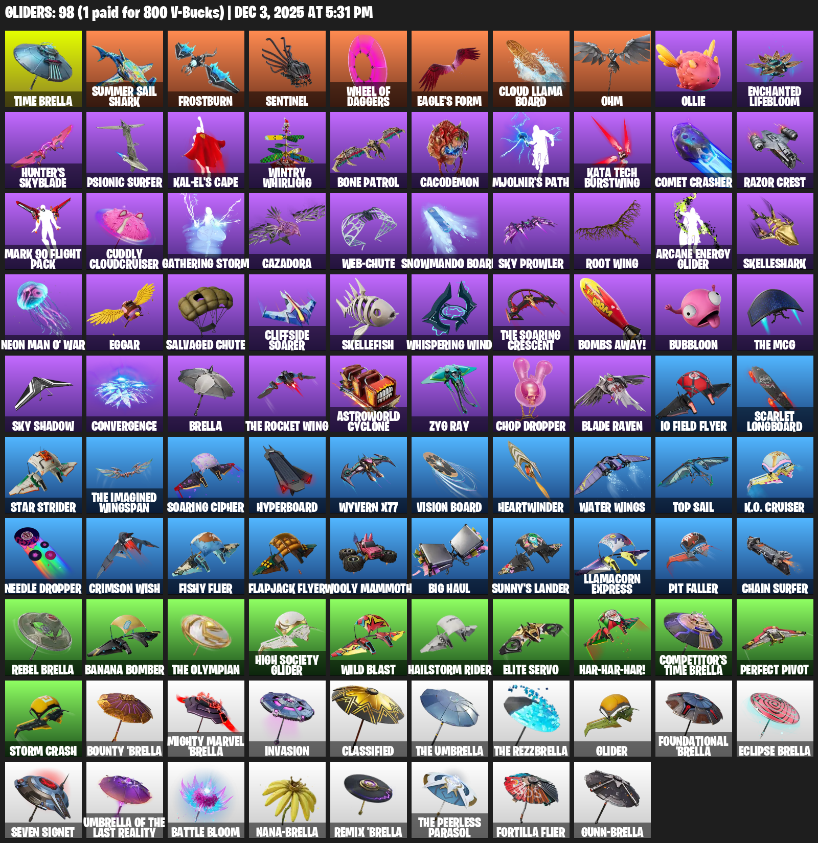 Time Brella, Summer Sail Shark, Frostburn, Sentinel, Eagle’s Form, Cloud Llama Board, Ohm, Ollie, Enchanted Lifebloom, Hunter’s Skyblade, Psionic Surfer, Kal-El’s Cape, Wintry Whirligig, Bone Patrol, Cacodemon, Mjolnir’s Path, Kata Tech Burstwing, Comet Crasher, Razor Crest