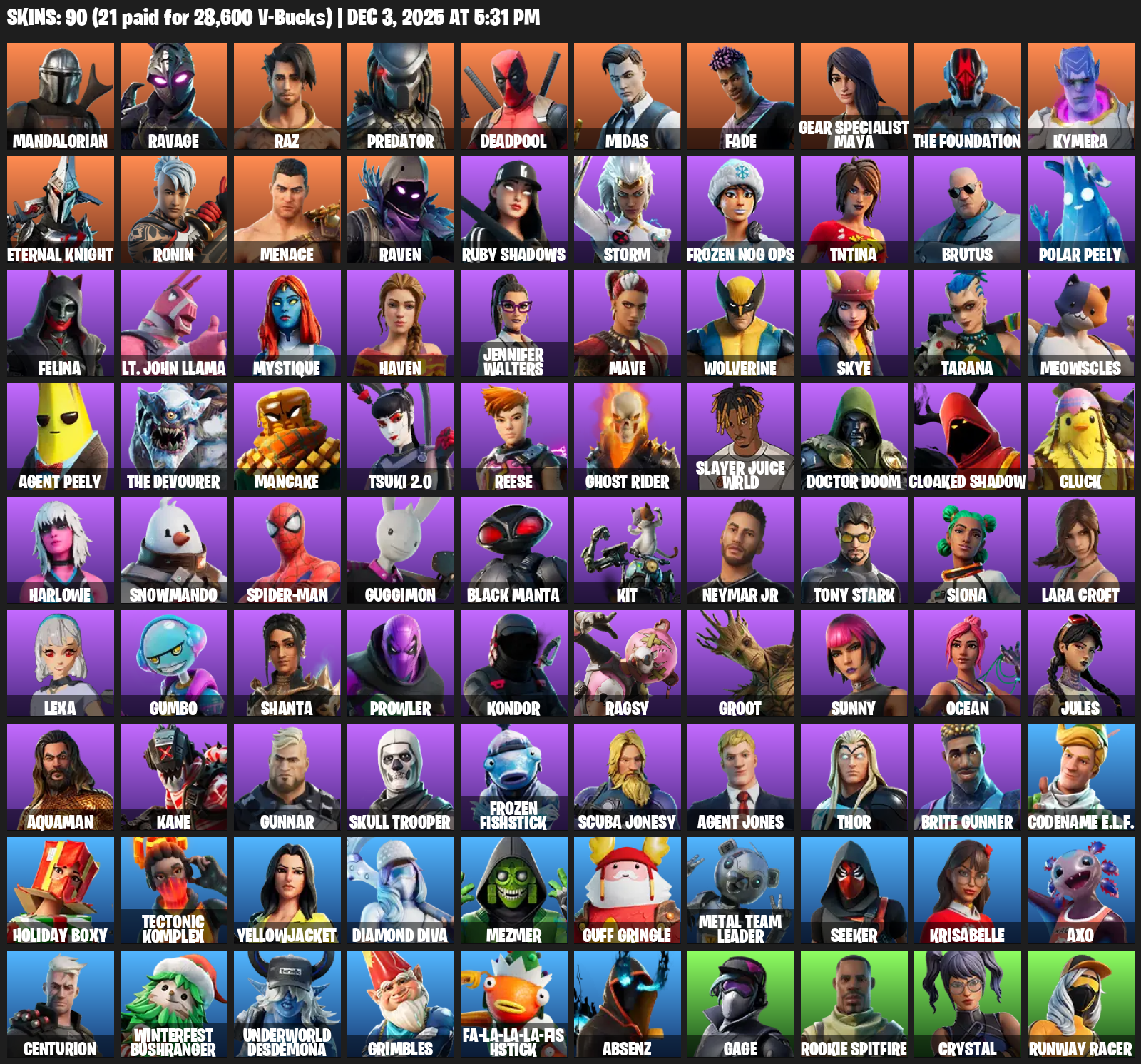 [PC/PSN] | 90 skins | 950 V-bucks | Lara Croft | Mandalorian | Ravage | Raz | Predator | Deadpool | Midas | Fade | Gear Specialist Maya | #EIC0371