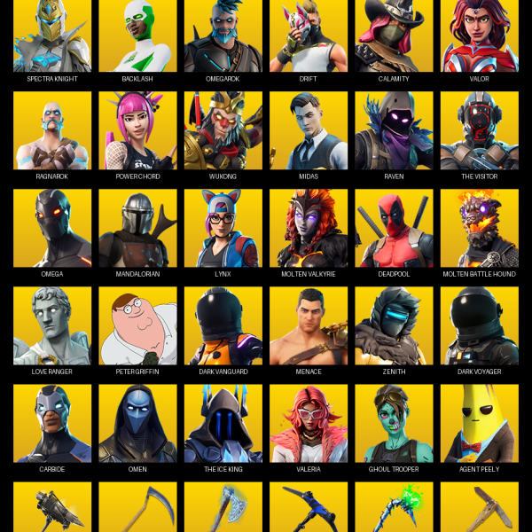 Travis Scott, Blue Squire, The Reaper, Royale Knight, Elite Agent, Gear Specialist Maya, Astro Jack, Warpaint, Kratos, Rose Team Leader, Dire, Calamity, Fate, Raven, Drift, Zenith, Mandalorian, Galaxia, Dark Voyager