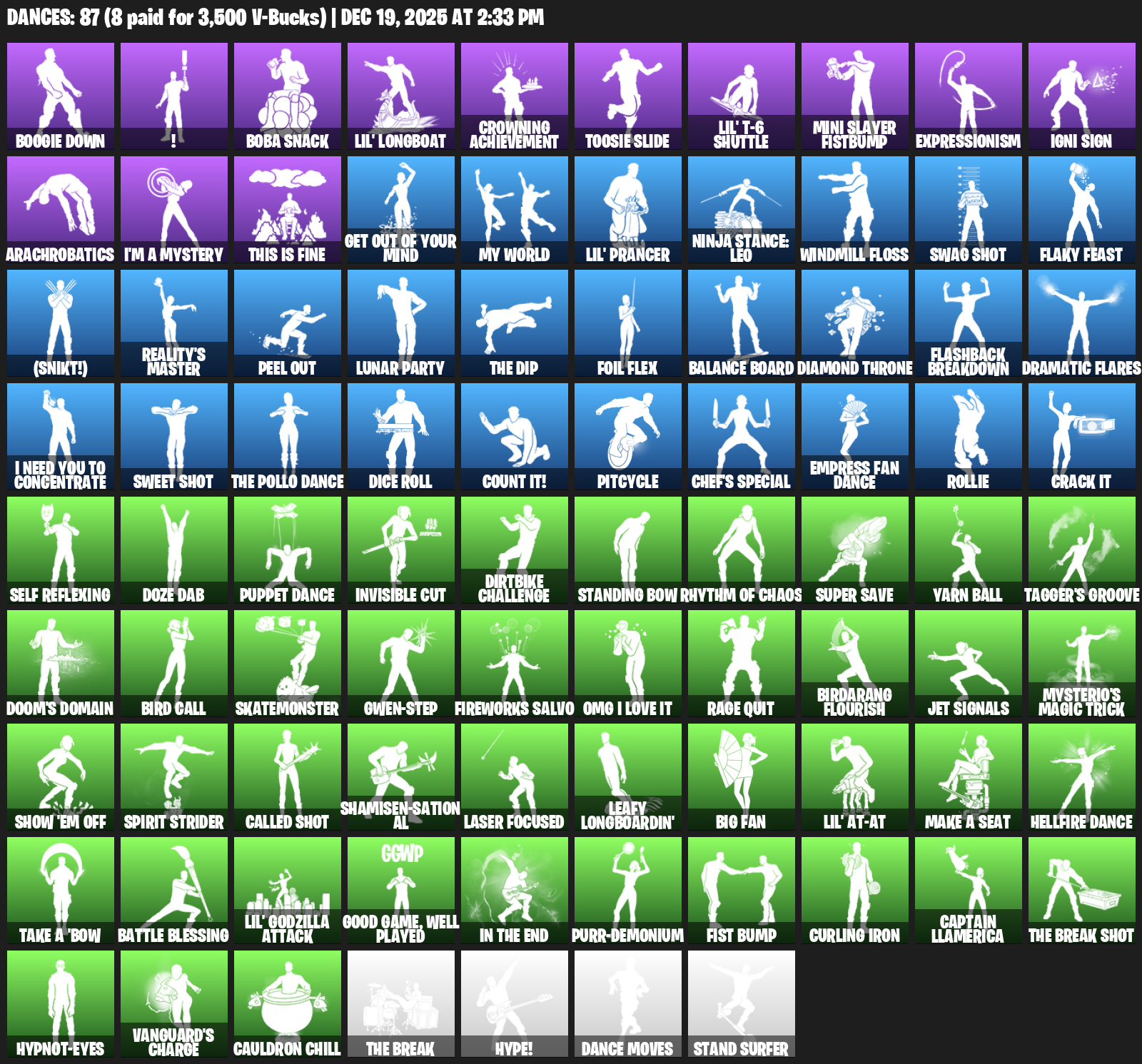 Boogie Down, !, Boba Snack, Lil’ Longboat, Crowning Achievement, Toosie Slide, Expressionism, Igni Sign, Arachrobatics, I’m a Mystery, This is Fine, Get Out of Your Mind, My World, Ninja Stance: Leo, Windmill Floss, Swag Shot, Flaky Feast