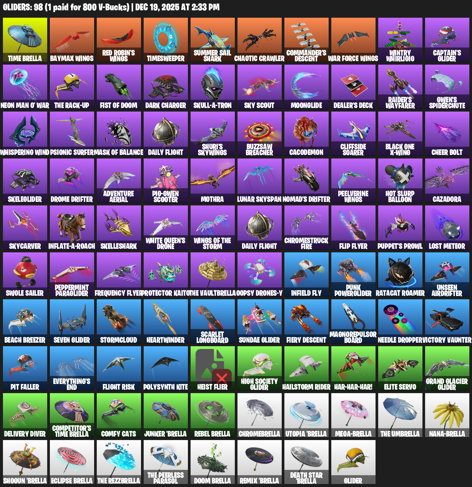 Time Brella, Baymax Wings, Timesweeper, Summer Sail Shark, Chaotic Crawler, Commander’s Descent, Wintry Whirligig, Captain’s Glider, Neon Man O’ War, Dark Charger, Sky Scout, Moonglide, Dealer’s Deck, Raider’s Wayfarer, Gwen’s Spiderchute
