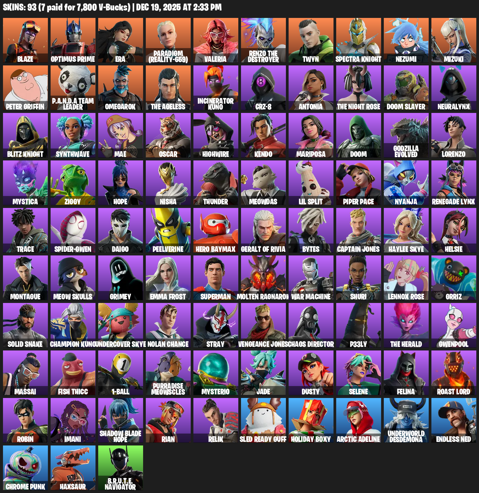 [PC/PSN] | 93 skins | 650 V-bucks | Blaze | Optimus Prime | Era | Paradigm (Reality-659) | Valeria | Renzo the Destroyer | Twyn | #NRK6283