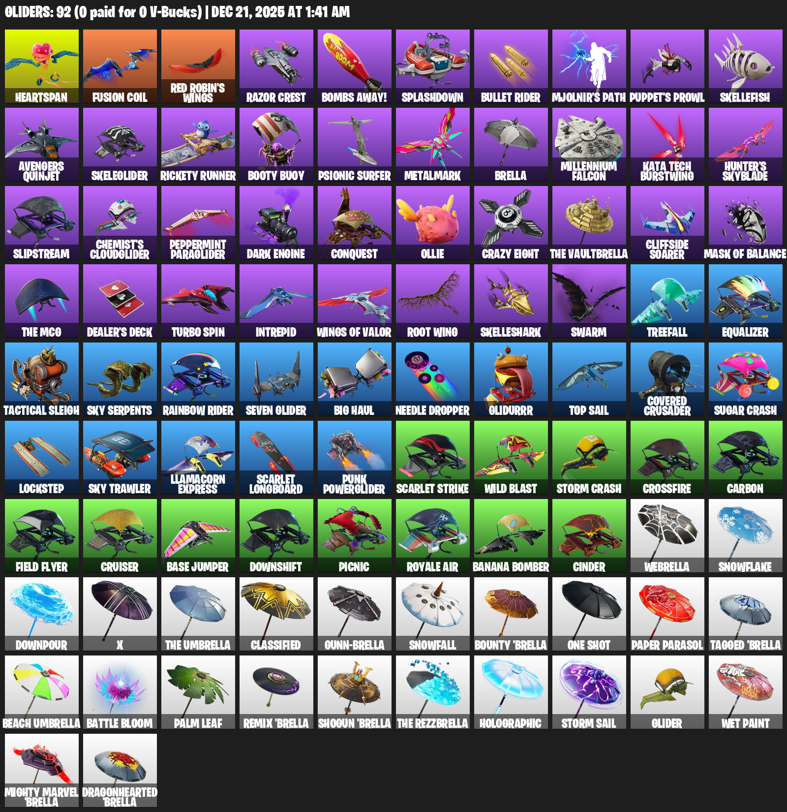 Heartspan, Razor Crest, Bombs Away!, Splashdown, Bullet Rider, Mjolnir’s Path, Puppet’s Prowl, Skellefish, Avengers Quinjet, Skeleglider, Rickety Runner, Booty Buoy, Psionic Surfer, Metalmark, Brella, Millennium Falcon, Kata Tech Burstwing, Hunter’s Skyblade