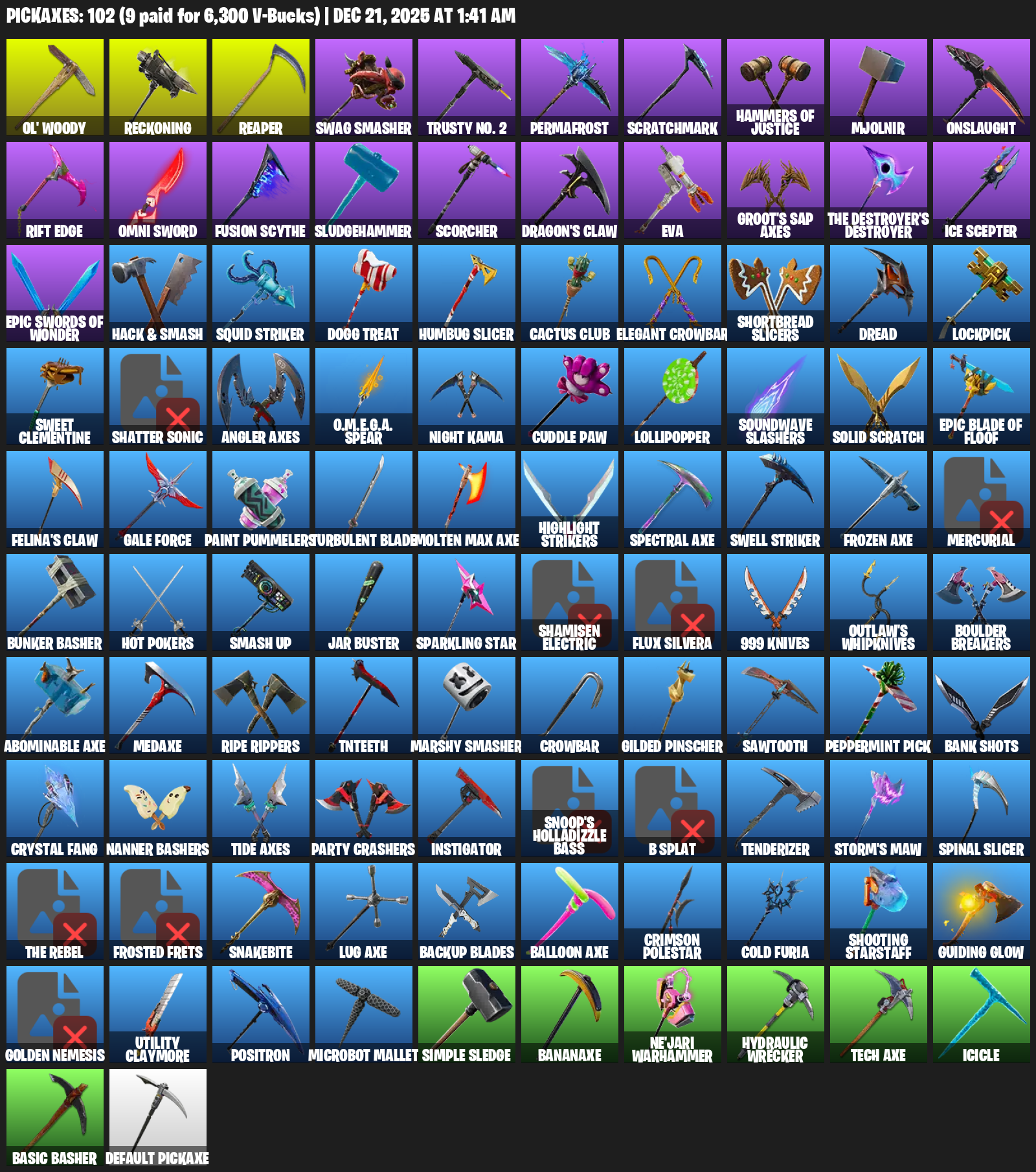 Ol’ Woody, Reckoning, Swag Smasher, Trusty No. 2, Permafrost, Scratchmark, Hammers of Justice, Mjolnir, Onslaught, Rift Edge, Omni Sword, Fusion Scythe, Sludgehammer, Scorcher, Dragon’s Claw, EVA, Groot’s Sap Axes, Ice Scepter