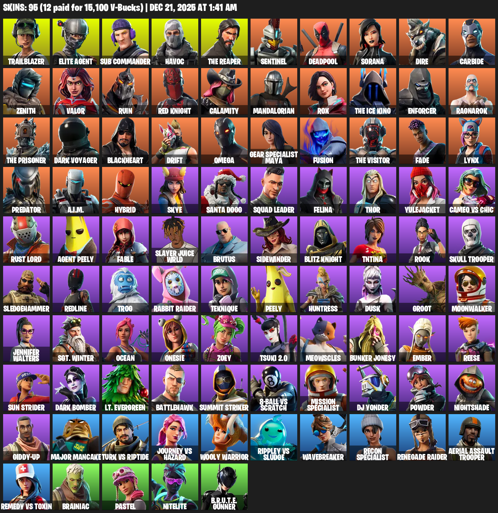 Elite Agent, The Reaper, Omega, Gear Specialist Maya, Renegade Raider, Aerial Assault Trooper, Trailblazer, Sub Commander, Havoc, Sentinel, Deadpool, Sorana, Dire, Carbide, Zenith, Valor, Ruin, Red Knight, Calamity, Mandalorian