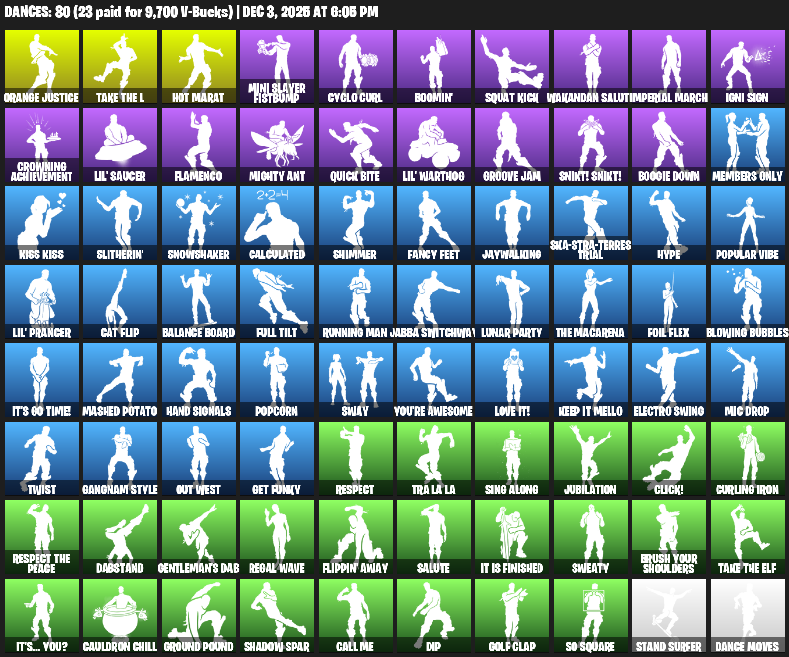 Hot Marat, Orange Justice, Mini Slayer Fistbump, Cyclo Curl, Boomin’, Squat Kick, Wakandan Salute, Imperial March, Igni Sign, Crowning Achievement, Lil’ Saucer, Flamenco, Mighty Ant, Quick Bite, Groove Jam, Snikt! Snikt!, Boogie Down, Members Only