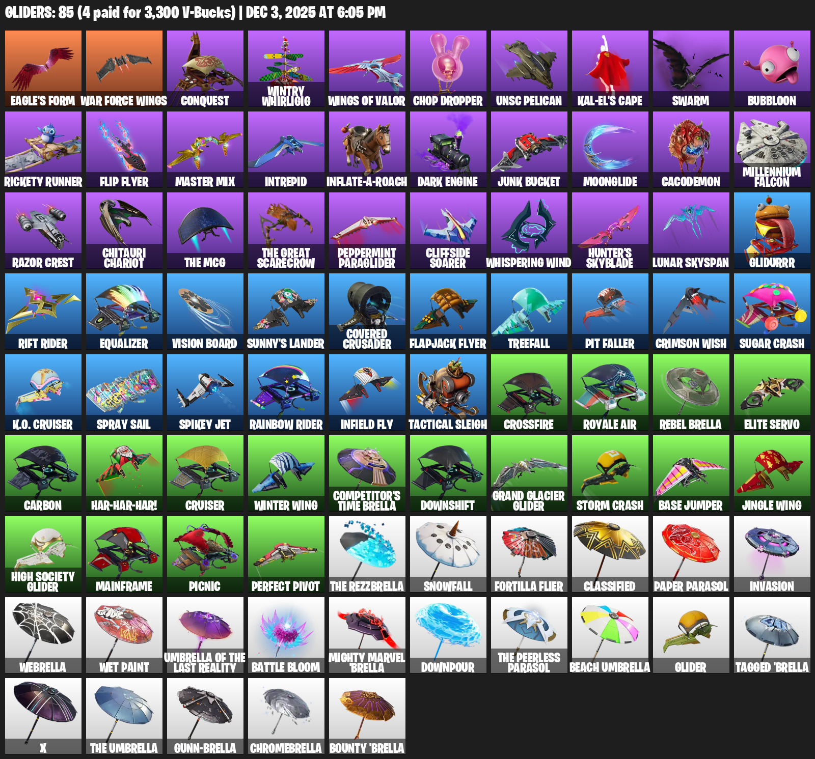 Eagle’s Form, War Force Wings, Conquest, Wintry Whirligig, Chop Dropper, UNSC Pelican, Kal-El’s Cape, Swarm, Bubbloon, Rickety Runner, Flip Flyer, Intrepid, Inflate-A-Roach, Junk Bucket, Moonglide, Cacodemon, Millennium Falcon