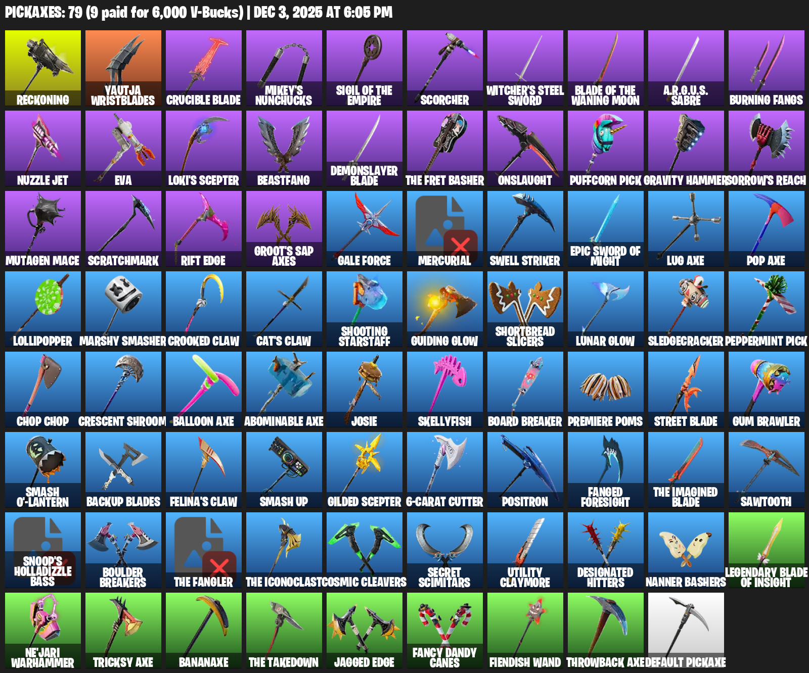Reckoning, Yautja Wristblades, Crucible Blade, Mikey’s Nunchucks, Sigil of the Empire, Scorcher, Witcher’s Steel Sword, A.R.G.U.S. Sabre, Burning Fangs, Nuzzle Jet, EVA, Loki’s Scepter, Beastfang, Onslaught, Puffcorn Pick, Gravity Hammer, Sorrow’s Reach