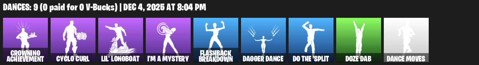 Crowning Achievement, Cyclo Curl, Lil’ Longboat, I’m a Mystery, Flashback Breakdown, Dagger Dance, Doze Dab