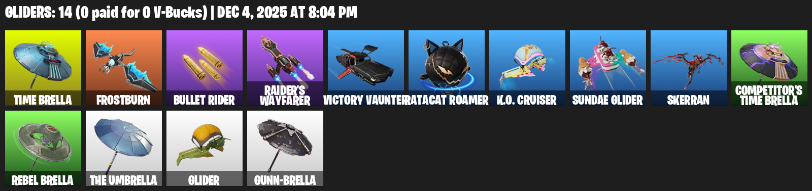 Time Brella, Frostburn, Bullet Rider, Raider’s Wayfarer, Victory Vaunter, Ratacat Roamer, K.O. Cruiser, Sundae Glider, Skerran