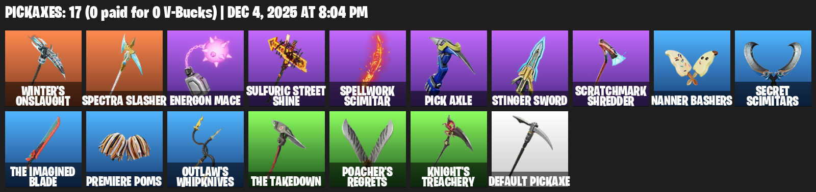 Winter’s Onslaught, Energon Mace, Sulfuric Street Shine, Spellwork Scimitar, Pick Axle, Stinger Sword, Scratchmark Shredder, Nanner Bashers, Secret Scimitars, The Imagined Blade, Premiere Poms, Outlaw’s Whipknives, Poacher’s Regrets, Knight’s Treachery, Default Pickaxe