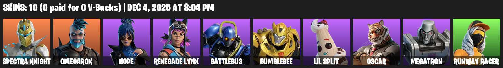 [PC/PSN/XBOX] | 10 skins | 650 V-bucks | Spectra Knight | Omegarok | Hope | Renegade Lynx | BattleBus | Bumblebee | Lil Split | Oscar | #NJB1856