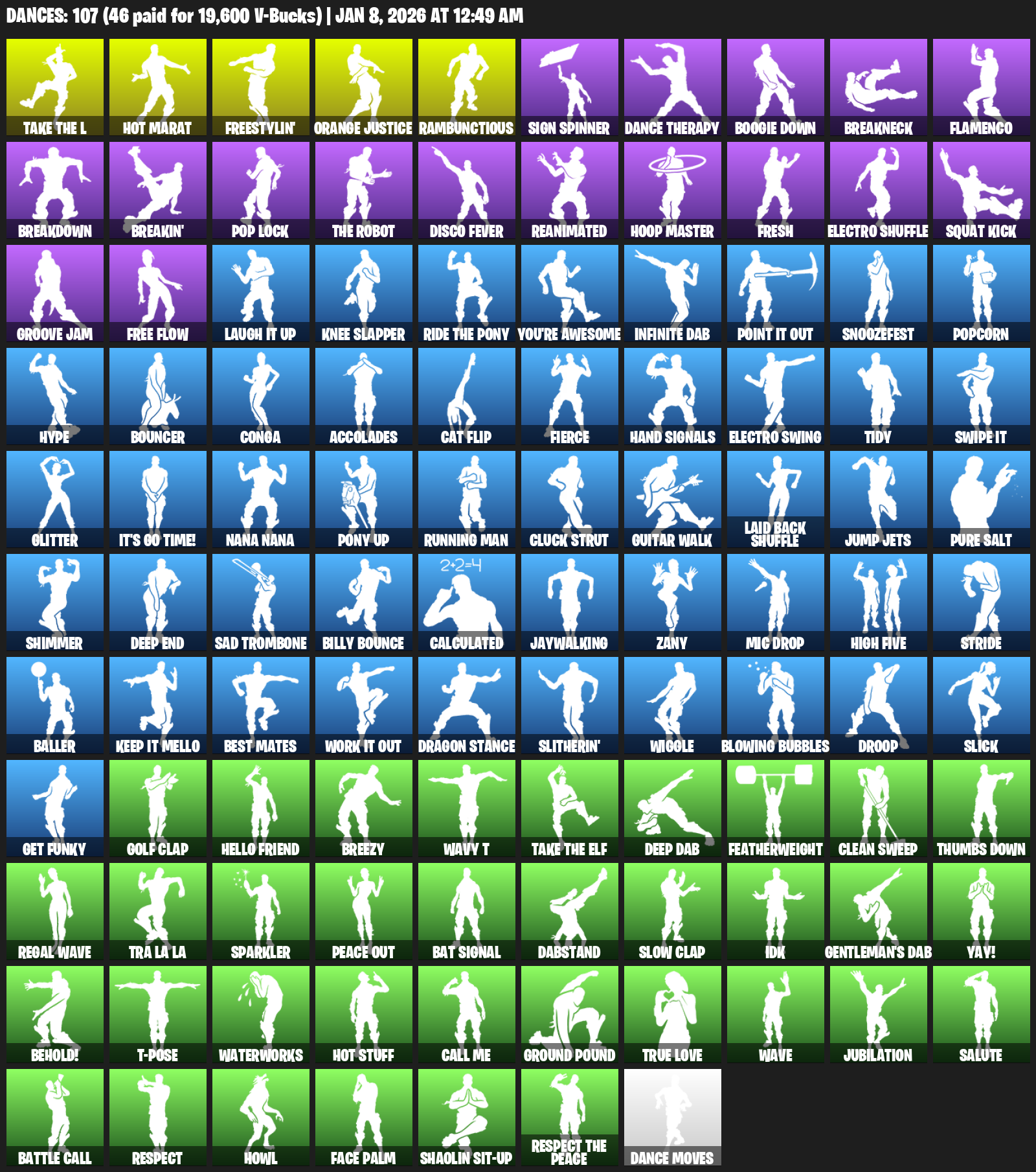Hot Marat, Freestylin’, Orange Justice, Rambunctious, Sign Spinner, Dance Therapy, Boogie Down, Breakneck, Flamenco, Breakdown, Breakin’, Pop Lock, Disco Fever, Reanimated, Hoop Master, Fresh, Electro Shuffle, Squat Kick